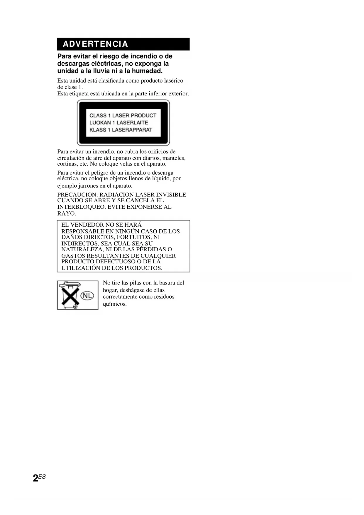 ADVERTENCIA Para evitar el riesgo de incendio o de descargas eléctricas, no exponga la unidad a la lluvia ni a la humedad. Esta unidad está clasificada como producto lasérico de clase 1. Esta etiqueta está ubicada en la parte inferior exterior. Para evitar un incendio, no cubra los orificios de circulación de aire del aparato con diarios, manteles, cortinas, etc. No coloque velas en el aparato. Para evitar el peligro de un incendio o descarga eléctrica, no coloque objetos llenos de líquido, por ejemplo jarrones en el aparato.