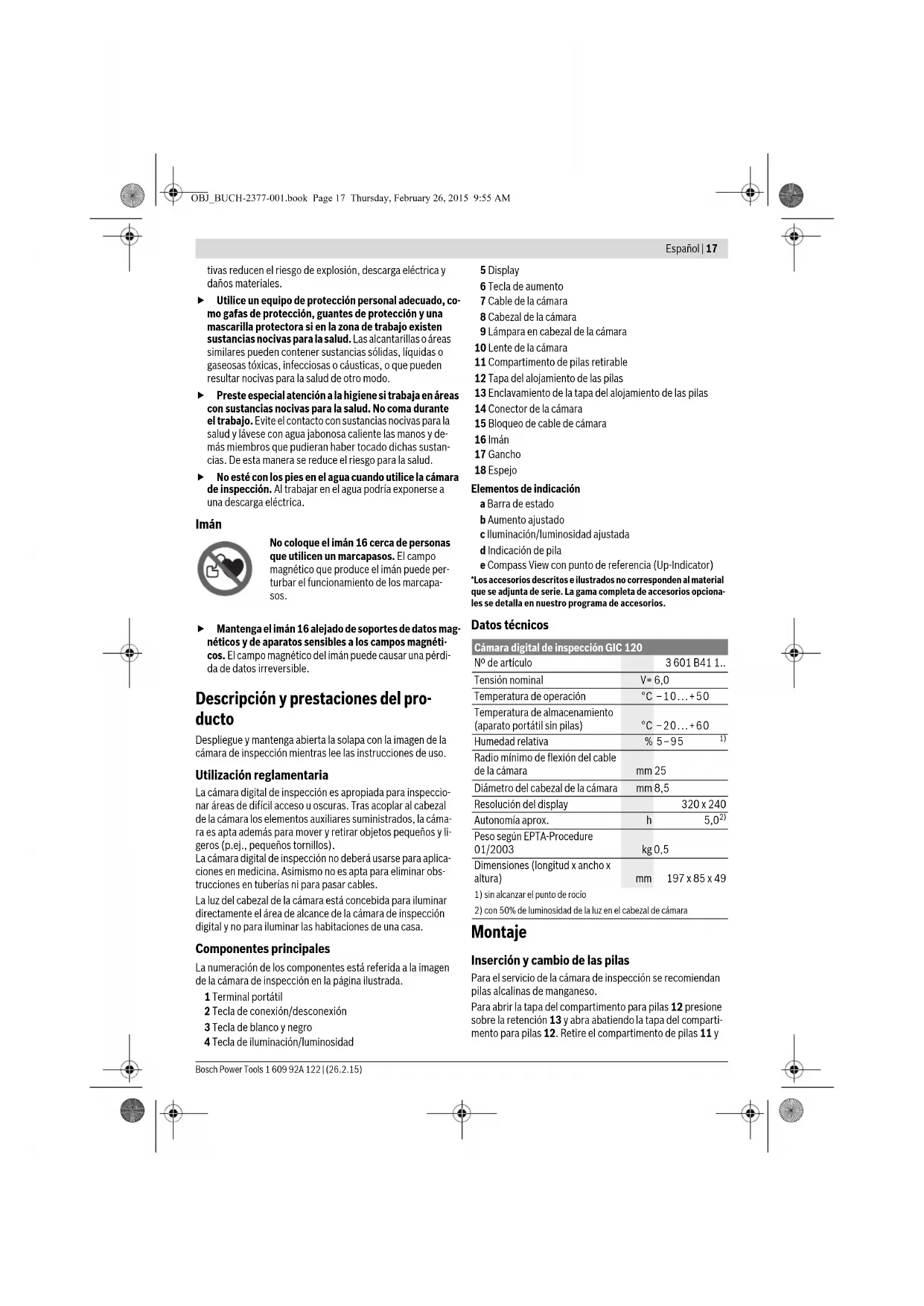 En caso de un bajo estado de carga de las pilas aparece prime- ro el símbolo en el display. Cuando el símbolo de pila está vacío, se tienen que cambiar las pilas; ya no se pueden reali- zar inspecciones. Siempre sustituya todas las pilas al mismo tiempo. Utilice pi- las del mismo fabricante e igual capacidad. Retire las pilas de la cámara de inspección, si no va a utilizarla durante un periodo largo. Si se almacena du- rante mucho tiempo, las pilas pueden corroerse y autodes- cargarse. Conexión del cable de la cámara (ver figura A) Para el funcionamiento de la cámara de inspección es necesa- rio conectar el cable de la cámara 7 al terminal portátil 1. Inserte el enchufe del cable de la cámara 7 en la posición co- rrecta sobre el conector de la cámara 14, hasta que encastre. Desmontar el cable de la cámara (ver figura B) Para quitar el cable de la cámara 7, comprima la retención 15 y retire el enchufe del aparato portátil 1. Montaje del espejo, imán o gancho (ver figuraC) El espejo 18, el imán 16 y el gancho 17 son elementos auxilia- res que pueden acoplarse al cabezal de la cámara 8. Presione hasta el tope en la ranura del cabezal de la cámara 8 uno de los tres elementos auxiliares, según figura. Observación: El imán 16 y el gancho 17 solamente son apro- piados para mover y retirar objetos pequeños y ligeros que no requieran aplicar gran fuerza. En caso de aplicar una fuerza excesiva puede llegar a deteriorarse la cámara de inspección o el elemento auxiliar. Operación Proteja el aparato portátil 1 y las pilas ante la humedad y la irradiación solar directa. En caso de un montaje co- rrecto, el cable de la cámara y el cabezal de cámara son es- tancos al agua. No obstante, el aparato portátil y las pilas no están protegidos contra el agua; en caso del contacto con el agua existe el riesgo de una descarga eléctrica o da- ño. No exponga la cámara de inspección ni a temperaturas extremas ni a cambios bruscos de temperatura. No la deje, p.ej., en el coche durante un largo tiempo. Si la cá- mara de inspección ha sufrido un cambio fuerte de tempe- ratura, antes de ponerla en servicio, esperar primero a que se atempere. No utilice la cámara de inspección si estuviese empaña- da la lente del cabezal de la cámara 8. No conecte la cá- mara de inspección hasta que se haya evaporado la hu- medad. En caso contrario podría deteriorarse la cámara de inspección. La lámpara conectada 9 se puede calentar durante el servicio. No toque la lámpara para evitar quemaduras. Puesta en marcha Conexión/desconexión Para conectar la cámara de inspección pulse la tecla de co- nexión/desconexión 2. En el display 5 se visualiza por breve tiempo la pantalla de inicio. Observación: Si no está montado el cable de la cámara en la conexión, el display indica un mensaje de error. Para desconectar la cámara de inspección pulse nuevamente la tecla de conexión/desconexión 2. Si durante aprox. 20 minutos no se oprime ninguna tecla en la cámara de inspección, entonces se desconecta automática- mente para preservar las pilas. Ajuste de la lámpara en el cabezal de la cámara Para aclarar la imagen de la cámara, puede conectar la lámpa- ra 9 en el cabezal de cámara y regular la luminosidad. La luminosidad se puede ajustar a 4 niveles (0 %, 25 %, 50 %, 100 %). Para conectar la lámpara de la cámara 9 y para amplificar la lu- minosidad, oprima la tecla 4 tantas veces, hasta que se alcan- ce la luminosidad deseada. No mire directamente hacia la lámpara 9 ni tampoco la dirija contra otras personas. La luz de la lámpara puede deslumbrar la vista. Para reducir la luminosidad y para desconectar la lámpara de la cámara 9, oprima la tecla 4 tantas veces, hasta que se al- cance la luminosidad deseada o se ha apagado la lámpara. Ampliar la imagen en el display (Zoom) Oprimiendo brevemente la tecla 6 puede aumentar la imagen en el display 1,5 veces o 2 veces. Tecla de blanco y negro Oprimiendo brevemente la tecla 3 puede conmutar el display entre reproducción en color y en blanco y negro. Mediante la reproducción en blanco y negro se puede mejorar p. ej. el contraste. Compass View con punto de referencia (Up-Indicator) (ver figura D) Oprimiendo prolongadamente la tecla 3 se llega al Compass View e. El punto de referencia amarillo (Up-Indicator) indica en ello, donde se encuentra en la imagen físicamente “arriba”. Observación: Funcionamiento limitado con espejo montado 18 y/o con alineación vertical del cable de la cámara 7. Barra de estado La barra de estado a se muestra tras cada pulsación de tecla durante aprox. 2 segundos en el display. Ésta indica: – el aumento ajustado (b) – la luminosidad ajustada (c) – el estado de carga de las pilas (d). Instrucciones para la operación Examine el entorno que desee inspeccionar y preste especial atención a los obstáculos y puntos de peligro existentes. OBJ_BUCH-2377-001.book Page 18 Thursday, February 26, 2015 9:55 AMEspañol | 19 Bosch Power Tools 1 609 92A 122 | (26.2.15) Doble el cable de la cámara 7 de manera que su cabezal pueda introducirse con facilidad en el lugar a inspeccionar. Vaya in- troduciendo el cable de la cámara con cuidado. Ajuste la intensidad de la lámpara 9 de manera que pueda apreciarse bien la imagen obtenida. En los objetos altamente reflectantes, por ejemplo, puede obtenerse una imagen me- jor ajustando una luz menos intensa. Si los objetos a examinar se representan borrosos, reduzca o aumente la separación entre el cabezal de la cámara 8 y el ob- jeto. Mantenimiento y servicio Mantenimiento y limpieza No sumerja el terminal portátil 1 en agua ni en otros líquidos. Mantenga limpia siempre la cámara de inspección. Limpie mi- nuciosamente la cámara de inspección y todos los elementos auxiliares si han quedado expuestos a sustancias nocivas pa- ra la salud. Limpiar el aparato con un paño húmedo y suave. No usar de- tergentes ni disolventes. Limpie ante todo con regularidad