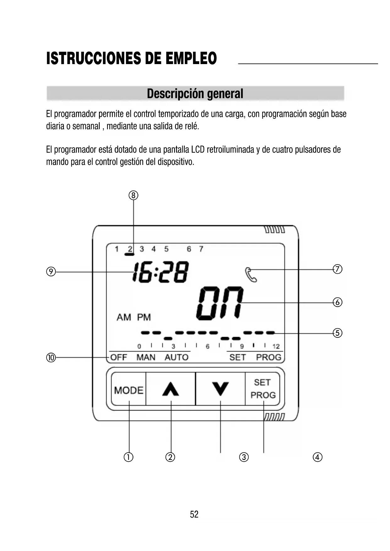 El programador está dotado de una pantalla LCD retroiluminada y de cuatro pulsadores de mando para el control gestión del dispositivo.