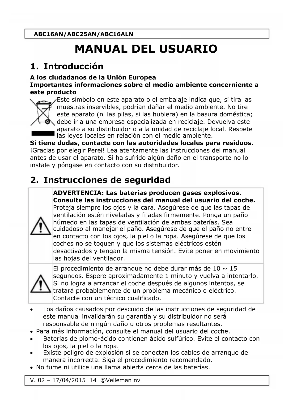 Utilice este aparato sólo con los accesorios originales. Velleman NV no será responsable de daños ni lesiones causados por un uso (indebido) de este aparato. Para más información sobre este producto y la versión más reciente de este manual del usuario, visite nuestra página www.perel.eu. Se pueden modificar las especificaciones y el contenido de este manual sin previo aviso.