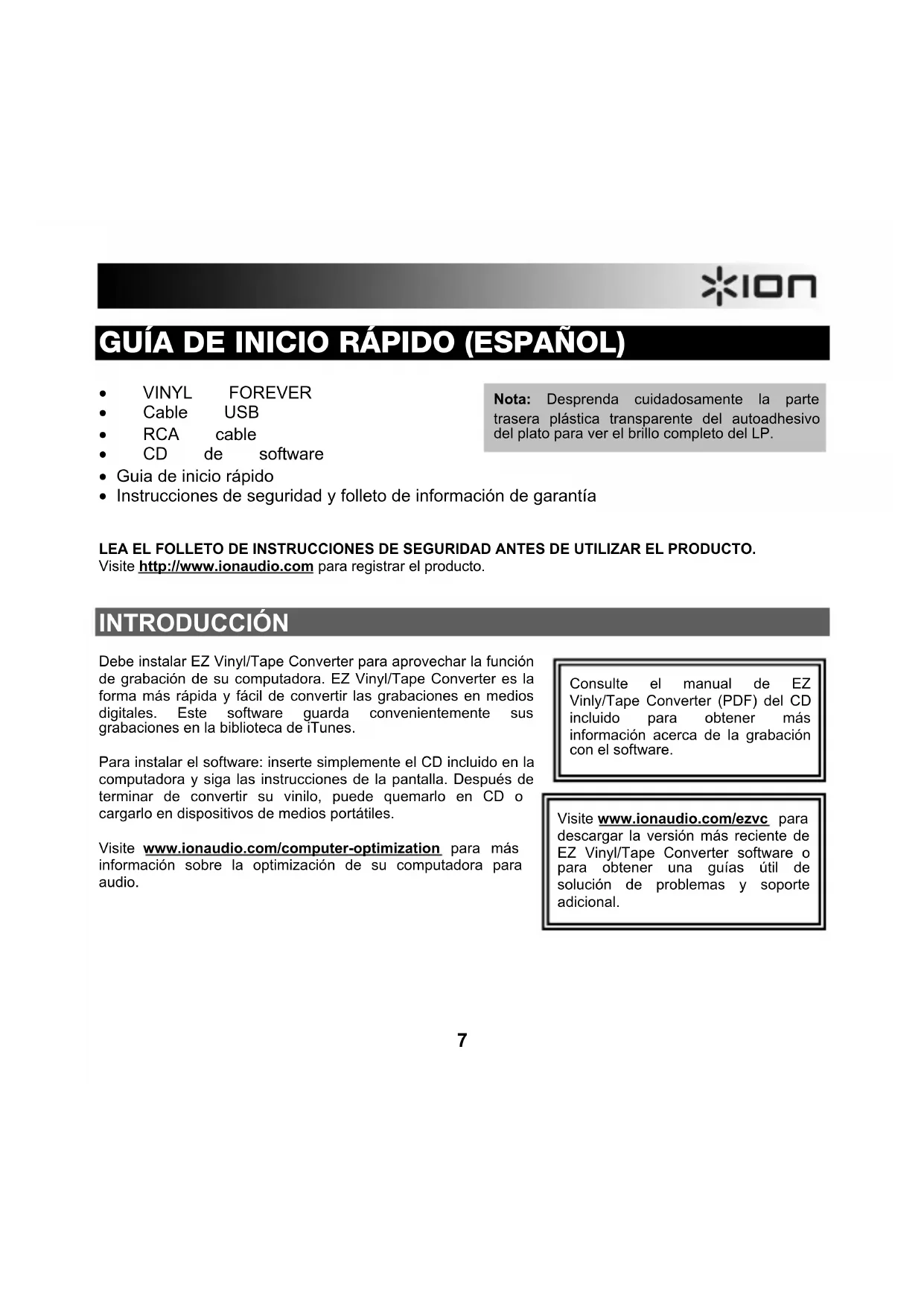 - Instrucciones de seguridad y folleto de información de garantía LEA EL FOLLETO DE INSTRUCCIONES DE SEGURIDAD ANTES DE UTILIZAR EL PRODUCTO. Visite http://www.ionaudio.com para registrar el producto. INTRODUCCIÓN Debe instalar EZ Vinyl/Tape Converter para aprovechar la función de grabación de su computadora. EZ Vinyl/Tape Converter es la forma más rápida y fácil de convertir las grabaciones en medios digitales. Este software guarda convenientemente sus grabaciones en la biblioteca de iTunes. Para instalar el software: inserte simplemente el CD incluido en la computadora y siga las instrucciones de la pantalla. Después de terminar de convertir su vinilo, puede quemarlo en CD o cargarlo en dispositivos de medios portátiles. Visite www.ionaudio.com/computer-optimization para más información sobre la optimización de su computadora para audio.