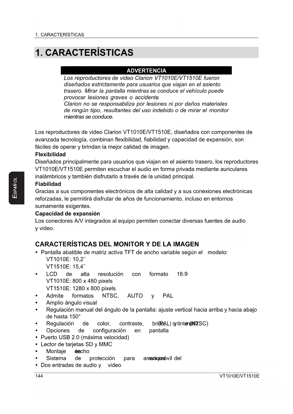 ADVER TENCIA Los reproductores de video Clarion VT1010E/VT1510E fueron diseñados estrictamente para usuarios que viajan en el asiento trasero. Mirar la pantalla mientras se conduce el vehículo puede provocar lesiones graves o accidente