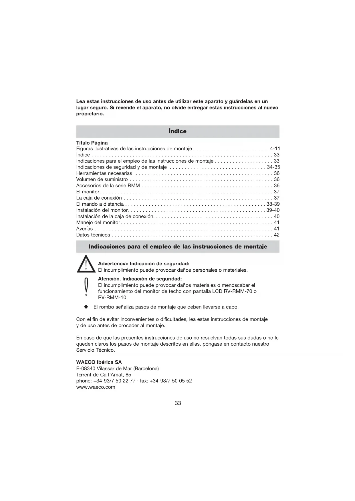 - Instalación del monitor Indicaciones generales de montaje Antes de proceder al montaje del monitor, tenga en cuenta lo siguiente: – Coloque el monitor en un lugar escogido a modo de prueba. – El monitor debe montarse sobre una superficie nivelada. – Antes de proceder al montaje definitivo, compruebe si se dispone del espacio necesario en la parte superior del lugar de montaje seleccionado para colocar las arandelas y las tuercas. –Tenga en cuenta el peso del monitor. ¿Se precisan refuerzos (arandelas o placas más grandes)? – ¿Es posible tender los cables de conexión y de prolongación hasta el monitor? – El monitor no debe colocarse en las proximidades del campo de actuación de un AIR BAG. El viajero podría resultar herido al dispararse el airbag. No monte el monitor a la altura de la cabeza.Instalación del monitor Efectúe una prueba de funcionamiento antes del montaje. Si el vehículo tuviera una iluminación del habitáculo instalada en un lugar adecuado, p. ej., entre el asiento del conductor y el del acompañante, se podría instalar en ese lugar el monitor de techo. Compruebe si la longitud del cable de conexión alcanza desde el lugar de montaje hasta la caja de conexión. Atención: asegúrese de que el monitor se puede fijar en el lugar de montaje de manera segura (véase H 1.4). ¿Es el recubrimiento del techo lo suficientemente estable? ¿Es posible efectuar una fijación segura y suficiente con los tornillos (véase H 1.5)? Compruebe si se puede abrir el monitor (véase H 1.5). Atención: la luz ambiental debe estar desconectada de la corriente para evitar que durante la instalación del monitor se puedan producir cortocircuitos, etc. Retire la luz ambiental (véase H 1.1). Monte la placa de montaje (véase H 1.2). Tienda el cable de conexión desde el monitor hasta el lugar previsto para la instalación de la caja de conexión. Conecte el cable de alimentación de la luz ambiental original a los conectores del monitor (no es necesario tener en cuenta la polaridad) (véase H 1.3). Enchufe el cable de conexión en la hembrilla (véase H 1.6). Respete sin falta las indicaciones de seguridad. Instalación de la caja de conexión El lugar de montaje debe estar protegido contra la humedad. Debido al diseño compacto, resulta recomendable efectuar el montaje debajo del tablero de instrumentos. La caja se puede fijar por medio de los tornillos de rosca cortante incluidos en el suministro o por medio de cinta de velcro autoadhesiva (no incluida en el suministro). Por favor, respete las indicaciones de seguridad y de montaje. La alimentación de tensión debería llevarse a cabo a través de una fuente de tensión conectada como, p. ej., el borne 15. Incluso cuando está desconectado (recepción de infrarrojos activada), el sistema presenta cierto consumo de potencia que, durante un periodo prolongado, es capaz de descargar la batería del vehículo. La caja de conexión ofrece entradas para 2 fuentes de vídeo (véase I 2). Puede tratarse de un reproductor de DVD (referencia WAECO DVD-PL-10), una cámara, etc. Introduzca los cables RCA de las fuentes de vídeo en las hembrillas VIDEO/AUDIO (véase I 2). Si sólo se emplea una entrada de audio, se genera una señal de audio mono. 40Manejo del monitor Una vez se haya completado la conexión, el monitor se enciende automáticamente tan pronto como se registre tensión de suministro (POWER DIRECT = ON);también es posible encender el aparato a través del mando a distancia (tecla POWER) (véase F 1.1). Si hay conectada una fuente de vídeo y está en uso, aparece la imagen y la señal se emite bien a través del auricular por infrarrojos que se suministra como accesorio HS-10 (véase G 1), o bien a través de la radio del vehículo (si se emplea el FM-MOD-10). Para cambiar el canal de vídeo, pulse la tecla AV (véase F 1.7) del mando a distancia. Si desea modificar los ajustes, puede hacerlo a través de las teclas MODE y VOL situadas en el monitor (véase D 1.5/1.6/1.7) o del mando a distancia (véase F 1.5/1.4). El monitor se puede girar hacia ambos lados y hacia atrás unos 15° (véanse G 1 y 2). Uso del auricular HS-10 Los monitores RV-RMM-70 y 104 están dotados de un emisor de infrarrojos. Dicho emi- sor permite utilizar el auricular inalámbrico por infrarrojos HS-10 (consulte las instruccio- nes del mismo si desea información más detallada). Si lo usa, colóquese en un campo de aprox. 120° en sentido horizontal y 60° en el vertical delante del monitor (véase G). Así, queda garantizada la recepción del sonido sin problemas. Averías La imagen tiembla La alimentación de tensión ha caído por debajo de 12 V. Cargue la batería del vehículo. Asegúrese de que el cable de conexión entre la fuente de tensión y la caja de conexión sea lo más corto posible. Secuencia de imágenes demasiado rápida El formato de video ajustado (COLOR SYSTEM) no es el adecuado para la fuente de vídeo. Modifique el formato, p. Ej., de NTSC a PAL. 41Datos técnicos Medidas (AxHxP): 210 x 230 x 40 mm (RV-RMM-70) Medidas (AxHxP): 285 x 310 x 40 mm (RV-RMM-104) Tensión de servicio: 12 V CC, máx. 15 V Consumo de corriente: máx. 16 Vatios incl. luz ambiental (RV-RMM-70) 18 Vatios incl. luz ambiental (RV-RMM-104) Tamaño de la imagen: 7”, 17,7 cm diagonal (RV-RMM-70) Tamaño de la imagen: 10,4”, 26,4 cm diagonal (RV-RMM-104) Píxeles: 337.000 píxeles (RV-RMM-70) Píxeles: 480.000 píxeles (RV-RMM-104) Sistema de vídeo: NTSC/PAL Temperatura de servicio: de 0 °C a +60 °C Peso: aprox. 1,5 kg (RV-RMM-70) Peso: aprox. 2,5 kg (RV-RMM-104) Queda reservado el derecho a efectuar actualizaciones técnicas. Conserve estas instrucciones de uso y entrégueselas, en caso de venta del aparato, al nuevo propietario. Si desea consultar cualquier duda que pudiera surgirle acerca del RV-RMM-70 o el RV-RMM-104, póngase en contacto con: WAECO Ibérica SA E-08340 Vilassar de Mar (Barcelona) Torrent de Ca I’Amat, 85 phone: +34-93/7 50