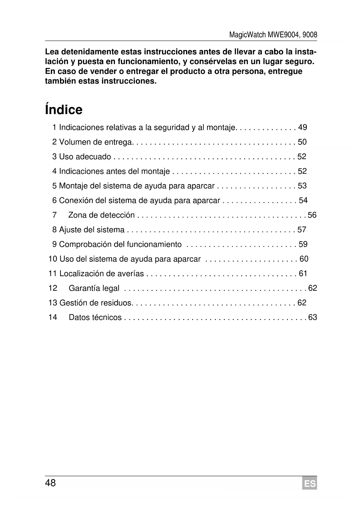 - 14 Datos técnicos ES MagicWatch MWE9004, 9008 Indicaciones relativas a la seguridad y al montaje p. 63