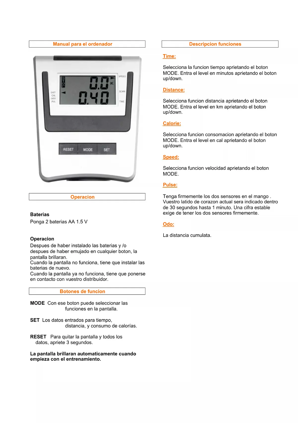 La lectura de Frequencia cardíaca a la que nos referimos en este manual es aproximada. No pueda utiliser como guía en cualquier programa cardio-vascular relacionado con enfermos, en este caso debe dirigirse a su Médico.