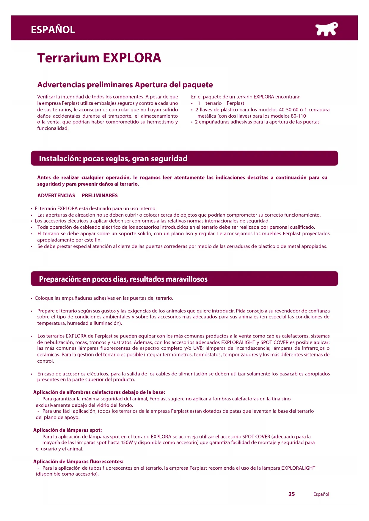 EXPLORALIGHT 15 W / T8EXPLORALIGHT 18 W / T8EXPLORALIGHT 30 W / T8EXPLORA 40EXPLORA 50EXPLORA 60EXPLORA 80EXPLORA 80 HEXPLORA 110EXPLORA 110 HEXPLORA 110 H25 Español ESPAÑOL Terrarium EXPLORA Verificar la integridad de todos los componentes. A pesar de que la empresa Ferplast utiliza embalajes seguros y controla cada uno de sus terrarios, le aconsejamos controlar que no hayan sufrido daños accidentales durante el transporte, el almacenamiento o la venta, que podrían haber comprometido su hermetismo y funcionalidad. Advertencias preliminares Apertura del paquete En el paquete de un terrario EXPLORA encontrará:
