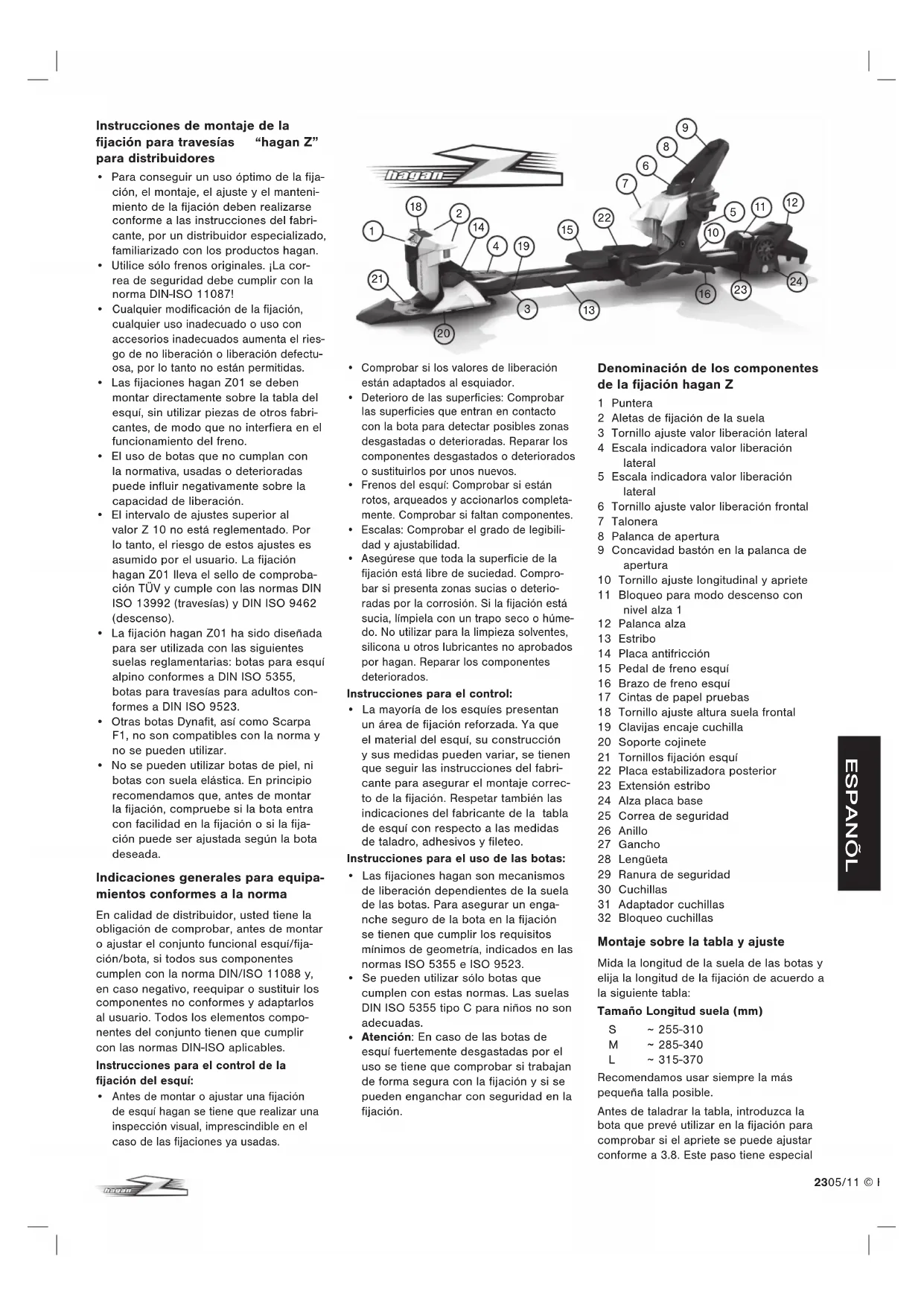 - La fijación hagan Z01 ha sido diseñada para ser utilizada con las siguientes suelas reglamentarias: botas para esquí alpino conformes a DIN ISO 5355, botas para travesías para adultos con- formes a DIN ISO 9523.