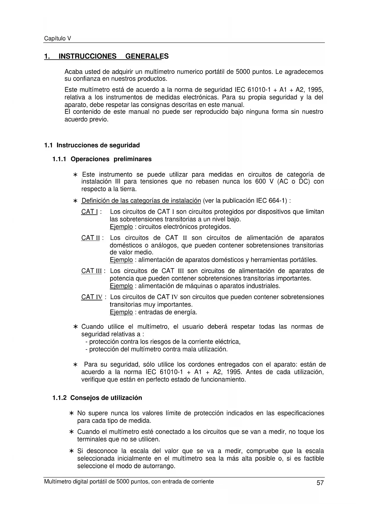 Este multímetro está de acuerdo a la norma de seguridad IEC 61010-1 + A1 + A2, 1995, relativa a los instrumentos de medidas electrónicas. Para su propiautralidad y la del aparato, deben Respectar las consignas descritas en este manual.