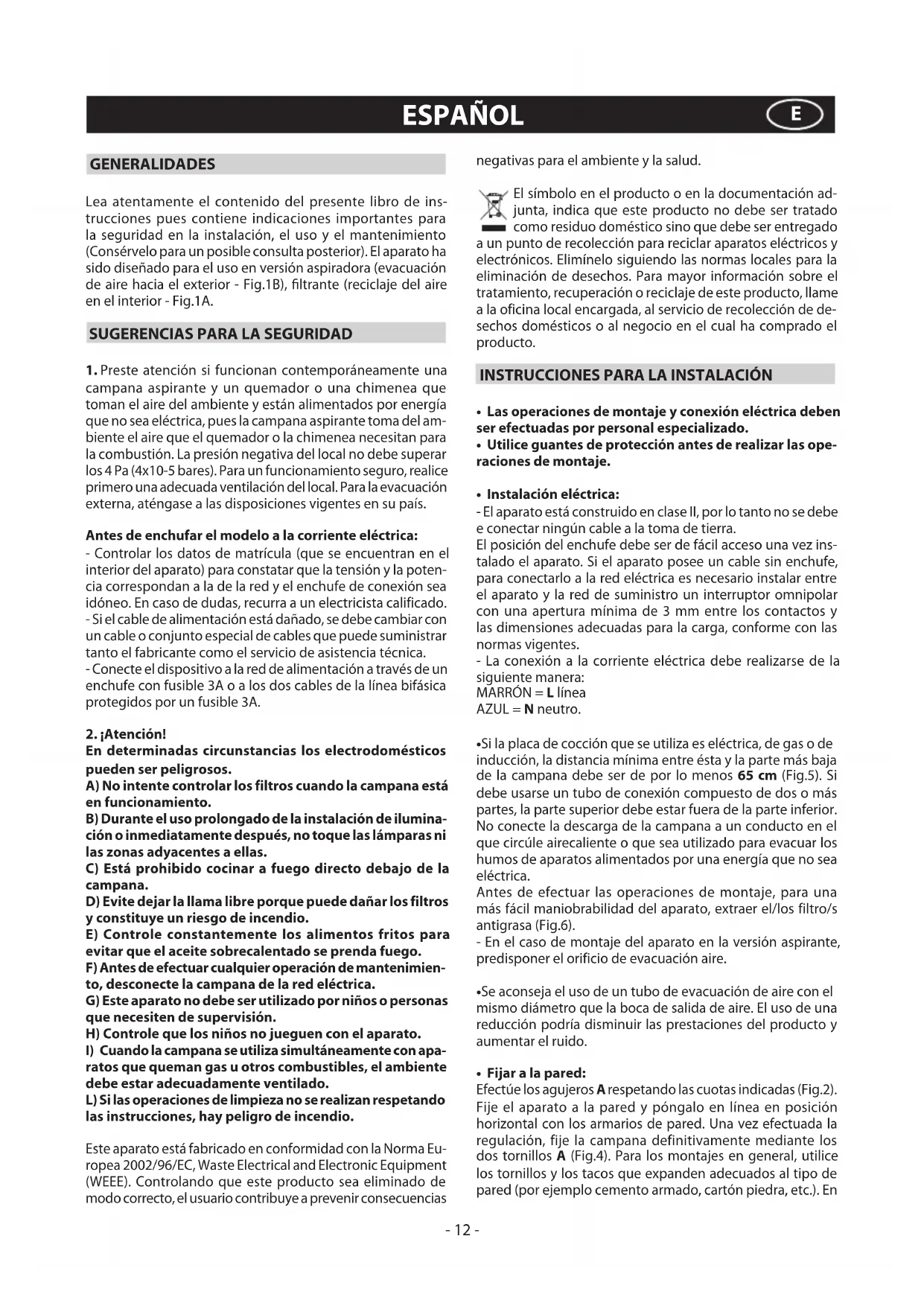 ratos que queman gas u otros combustibles, el ambiente debe estar adecuadamente ventilado. L) Si las operaciones de limpieza no se realizan respetando las instrucciones, hay peligro de incendio. Este aparato está fabricado en conformidad con la Norma Eu- ropea 2002/96/EC, Waste Electrical and Electronic Equipment (WEEE). Controlando que este producto sea eliminado de modo correcto, el usuario contribuye a prevenir consecuencias negativas para el ambiente y la salud. El símbolo en el producto o en la documentación ad- junta, indica que este producto no debe ser tratado como residuo doméstico sino que debe ser entregado a un punto de recolección para reciclar aparatos eléctricos y electrónicos. Elimínelo siguiendo las normas locales para la eliminación de desechos. Para mayor información sobre el tratamiento, recuperación o reciclaje de este producto, llame a la oficina local encargada, al servicio de recolección de de- sechos domésticos o al negocio en el cual ha comprado el producto.