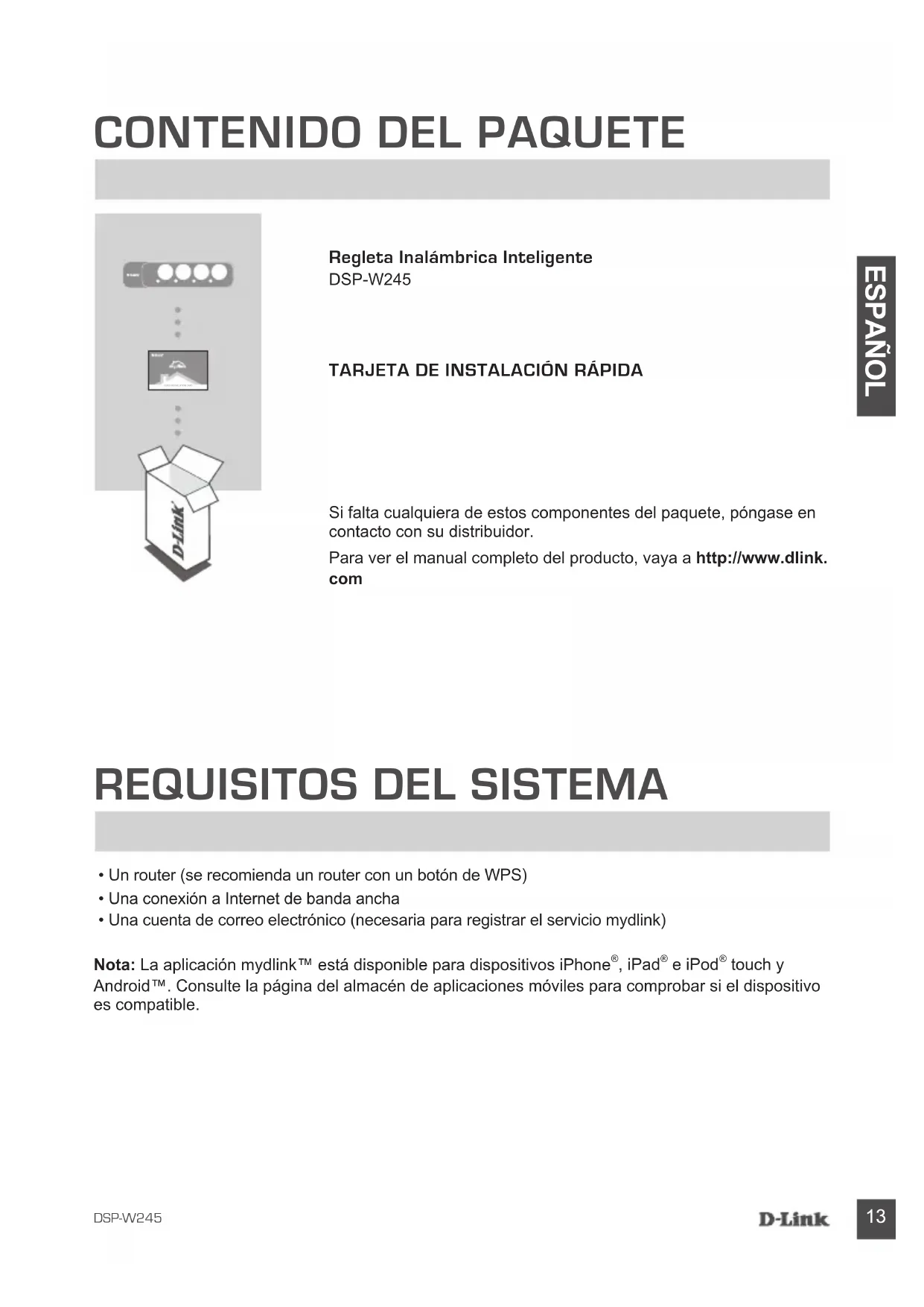 touch y Android™. Consulte la página del almacén de aplicaciones móviles para comprobar si el dispositivo es compatible. Si falta cualquiera de estos componentes del paquete, póngase en contacto con su distribuidor. Para ver el manual completo del producto, vaya a http://www.dlink. com