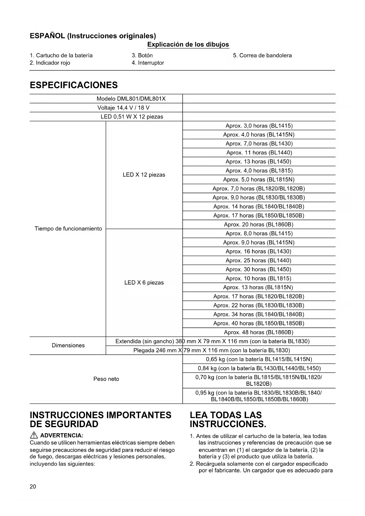 Modelo DML801/DML801X Voltaje 14,4 V / 18 V LED 0,51 W X 12 piezas Tiempo de funcionamiento LED X 12 piezas Aprox. 3,0 horas (BL1415) Aprox. 4,0 horas (BL1415N) Aprox. 7,0 horas (BL1430) Aprox. 11 horas (BL1440) Aprox. 13 horas (BL1450) Aprox. 4,0 horas (BL1815) Aprox. 5,0 horas (BL1815N) Aprox. 7,0 horas (BL1820/BL1820B) Aprox. 9,0 horas (BL1830/BL1830B) Aprox. 14 horas (BL1840/BL1840B) Aprox. 17 horas (BL1850/BL1850B) Aprox. 20 horas (BL1860B) LED X 6 piezas Aprox. 8,0 horas (BL1415) Aprox. 9,0 horas (BL1415N) Aprox. 16 horas (BL1430) Aprox. 25 horas (BL1440) Aprox. 30 horas (BL1450) Aprox. 10 horas (BL1815) Aprox. 13 horas (BL1815N) Aprox. 17 horas (BL1820/BL1820B) Aprox. 22 horas (BL1830/BL1830B) Aprox. 34 horas (BL1840/BL1840B) Aprox. 40 horas (BL1850/BL1850B) Aprox. 48 horas (BL1860B) Dimensiones Extendida (sin gancho) 380 mm X 79 mm X 116 mm (con la batería BL1830) Plegada 246 mm X 79 mm X 116 mm (con la batería BL1830) Peso neto 0,65 kg (con la batería BL1415/BL1415N) 0,84 kg (con la batería BL1430/BL1440/BL1450) 0,70 kg (con la batería BL1815/BL1815N/BL1820/ BL1820B) 0,95 kg (con la batería BL1830/BL1830B/BL1840/ BL1840B/BL1850/BL1850B/BL1860B)21 un tipo de batería puede crear un riesgo de incendio cuando se usa con otra batería.
