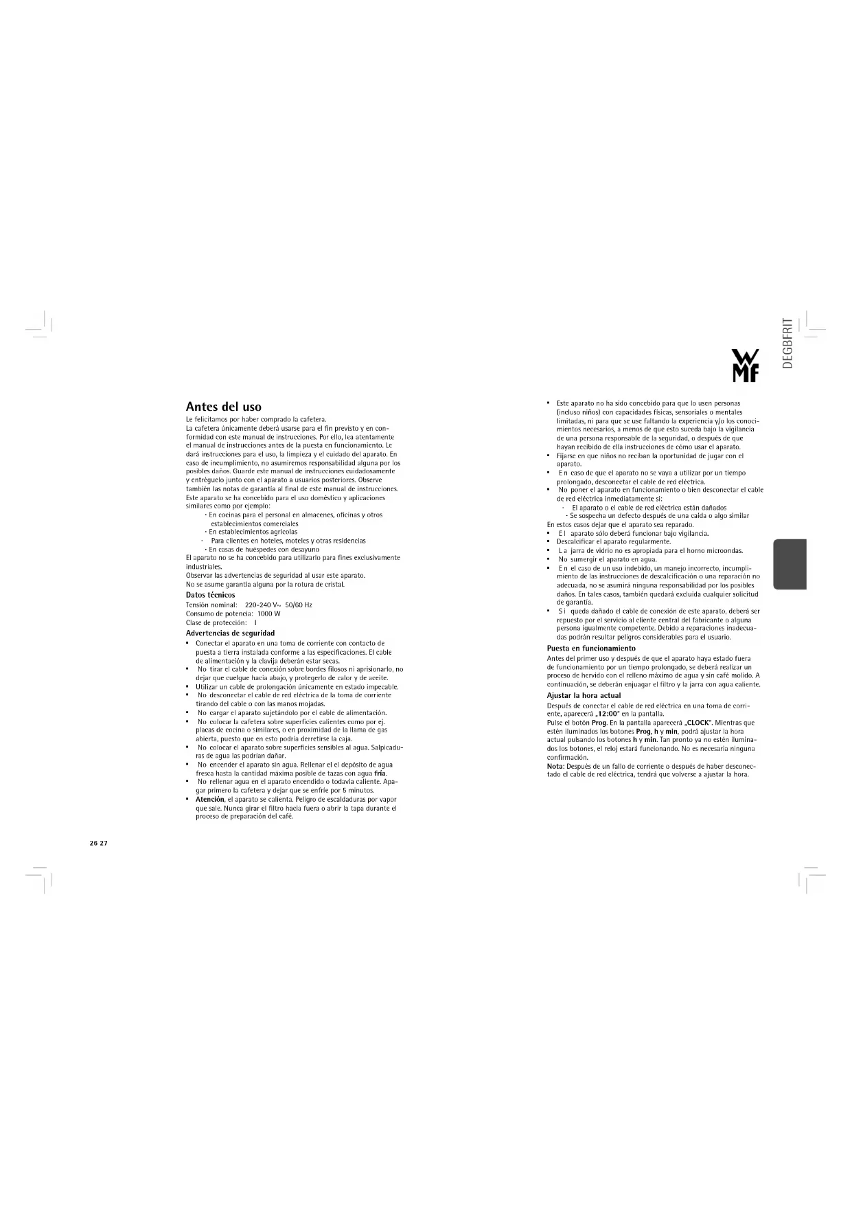 - S i queda dañado el cable de conexión de este aparato, deberá ser repuesto por el servicio al cliente central del fabricante o alguna persona igualmente competente. Debido a reparaciones inadecua- das podrán resultar peligros considerables para el usuario. Puesta en funcionamiento Antes del primer uso y después de que el aparato haya estado fuera de funcionamiento por un tiempo prolongado, se deberá realizar un proceso de hervido con el relleno máximo de agua y sin café molido. A continuación, se deberán enjuagar el filtro y la jarra con agua caliente. Ajustar la hora actual Después de conectar el cable de red eléctrica en una toma de corri- ente, aparecerá „12:00“ en la pantalla. Pulse el botón Prog. En la pantalla aparecerá „CLOCK“. Mientras que estén iluminados los botones Prog, h y min, podrá ajustar la hora actual pulsando los botones h y min. Tan pronto ya no estén ilumina- dos los botones, el reloj estará funcionando. No es necesaria ninguna confirmación. Nota: Después de un fallo de corriente o después de haber desconec- tado el cable de red eléctrica, tendrá que volverse a ajustar la hora.28 29 DEGBFRITESNLDASVFINO Programación de la hora de encendido El▪encendido▪automático▪del▪aparato▪inicia▪el▪proceso▪de▪preparación▪ del▪café▪automáticamente▪a▪la▪hora▪deseada.▪La▪hora▪de▪encendido▪ podrá▪ajustarse▪con▪hasta▪24▪horas▪de▪anticipación. Pulse▪el▪botón▪Prog▪dos▪veces.▪En▪la▪pantalla▪aparecerá▪„TIMER“.▪ Mientras▪que▪estén▪iluminados▪los▪botones▪Prog,▪h▪y▪min▪podrá▪cam- biar▪la▪hora▪de▪encendido▪pulsando▪los▪botones▪h▪y▪min.▪Tan▪pronto▪ya▪ no▪esten▪iluminados▪los▪botones,▪estará▪programada▪la▪nueva▪hora▪de▪ encendido. Podrá▪comprobar▪la▪hora▪de▪encendido▪en▪cualquier▪momento▪pul- sando▪dos▪veces▪el▪botón▪Prog.▪ Nota:▪Después▪de▪un▪fallo▪de▪corriente▪o▪después▪de▪haber▪desconec- tado▪el▪cable▪de▪red▪eléctrica,▪tendrá▪que▪volverse▪a▪ajustar▪la▪hora▪de▪ encendido. Preparación de café Para▪rellenar▪el▪depósito▪de▪agua▪podrá▪quitar▪el▪mismo.▪Meta▪sólo▪ agua▪fría▪en▪el▪depósito.▪El▪indicador▪de▪nivel▪de▪agua▪sirve▪para▪ indicar▪la▪cantidad▪de▪agua▪fresca▪que▪se▪requerirá▪para▪preparar▪la▪ cantidad▪deseada▪de▪tazas▪de▪125▪ml.▪La▪escala▪en▪el▪asa▪de▪la▪jarra▪de▪ vidrio▪indica▪la▪cantidad▪de▪tazas▪de▪125▪ml▪de▪café▪preparado. Para▪meter▪café▪molido,▪abra▪la▪tapa▪delantera.▪Meta▪un▪filtro▪de▪papel▪ del▪tamaño▪1▪x▪4▪en▪el▪filtro▪pero▪doble▪primero▪los▪bordes▪estampados.▪ El▪filtro▪de▪papel▪no▪deberá▪sobresalir▪por▪encima▪del▪borde▪del▪filtro;▪ por▪lo▪que▪deberá▪ser▪presionado▪ligeramente▪con▪la▪mano. Meta▪la▪cantidad▪requerida▪de▪café▪molido.▪Según▪el▪gusto▪personal,▪ se▪calcularán▪unos▪5-7▪g▪de▪café▪molido▪medio▪por▪taza.▪Si▪ha▪sido▪ molido▪demasiado▪finamente,▪es▪posible▪que▪se▪desborde▪el▪líquido▪del▪ filtro. Función Aroma Si▪desea▪preparar▪un▪café▪más▪intenso▪y▪aromático,▪podrá▪activar▪la▪ función▪Aroma.▪La▪misma▪se▪recomienda▪sobre▪todo▪para▪la▪prepara- ción▪de▪cantidades▪pequeñas.▪Para▪ello,▪pulse▪el▪botón▪Aroma.▪Hasta▪ que▪haya▪acabado▪la▪preparación▪estará▪iluminado▪el▪botón▪Aroma,▪y▪ en▪la▪pantalla▪aparacerá▪„Aroma“. Por▪favor,▪tenga▪en▪cuenta▪que▪se▪prolongará▪ligeramente▪el▪tiempo▪de▪ preparación. Encendido automático Si▪la▪preparación▪debe▪arrancar▪a▪la▪hora▪de▪encendido▪programada,▪ pulse▪el▪botón▪Auto.▪El▪botón▪estará▪iluminado▪y▪en▪la▪pantalla▪ aparecerá▪„AUTO“.▪ La▪preparación▪comenzará▪automáticamente▪a▪la▪hora▪de▪encendido▪ programada.▪El▪botón▪Auto▪se▪apagará,▪el▪botón interruptor▪estará▪ iluminado▪de▪color▪azul▪y▪en▪la▪pantalla▪aparecerá▪„BREW“. Si▪desea▪activar▪la▪función▪Aroma,▪deberá▪pulsar▪el▪botón▪Aroma▪antes▪ del▪botón▪Auto. Inicio inmediato Si▪el▪café▪debe▪ser▪preparado▪inmediatamente,▪pulse▪el▪botón▪ interruptor.▪El▪botón▪estará▪iluminado▪de▪color▪azul,▪en▪la▪pantalla▪ aparecerá▪„BREW“,▪y▪comenzará▪la▪preparación.▪ Si▪desea▪activar▪la▪función▪Aroma,▪deberá▪pulsar▪el▪botón▪Aroma▪antes▪ del▪botón▪interruptor. Podrá▪interrumpir▪la▪preparación▪en▪cualquier▪momento▪volviendo▪a▪ pulsar▪el▪botón▪interruptoriluminado▪de▪color▪azul. Espere▪algunos▪minutos▪hasta▪que▪todo▪el▪café▪haya▪pasado▪a▪la▪jarra.▪ Después▪de▪haber▪sacado▪la▪jarra,▪una▪válvula▪antigoteo▪evitará▪que▪el▪ café▪restante▪gotee▪sobre▪la▪placa▪calentadora. Mantener el café caliente Sobre▪la▪placa▪calentadora,▪el▪café▪se▪mantiene▪a▪la▪temperatura▪ade- cuada▪para▪servirlo▪durante▪hasta▪1▪hora.▪Podrá▪apagar▪en▪cualquier▪ momento▪pulsando▪el▪botón▪interruptor. Antes▪de▪que▪pueda▪volver▪a▪prepararse▪café,▪el▪aparato▪deberá▪enfri- arse▪por▪5▪minutos. Limpieza Desconecte▪el▪cable▪de▪red▪eléctrica▪y▪deje▪que▪el▪aparato▪se▪enfríe. No▪sumerja▪el▪aparato▪en▪agua,▪sino▪frote▪su▪exterior▪con▪un▪trapo▪ húmedo▪al▪que▪ha▪agregado▪una▪pequeña▪cantidad▪de▪detergente▪ lavavajillas.▪No▪utilice