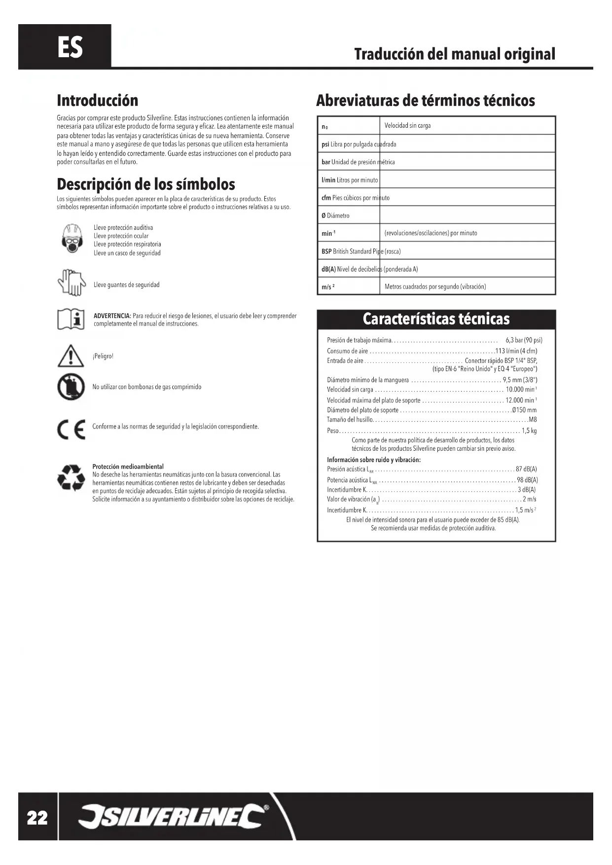Metroscuadradosporsegundo(vibración) Introducción GraciasporcompraresteproductoSilverline.Estasinstruccionescontienenlainformación necesariaparautilizaresteproductodeformasegurayeficaz.Leaatentamenteestemanual paraobtenertodaslasventajasycaracterísticasúnicasdesunuevaherramienta.Conserve estemanualamanoyasegúresedequetodaslaspersonasqueutilicenestaherramienta lohayanleídoyentendidocorrectamente.Guardeestasinstruccionesconelproductopara poderconsultarlasenelfuturo. 580430_OwnerManual.indd 22580430_OwnerManual.indd 22 29/02/2024 10:4429/02/2024 10:44Lijadora pulidora neumática 150 mm580430