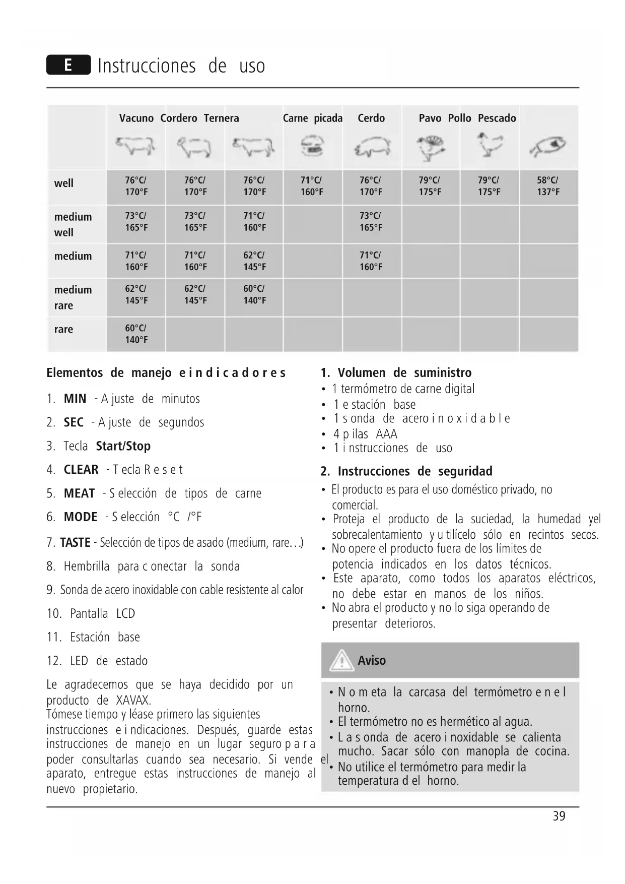 Antes de poner en funcionamiento el aparato, limpie la sonda bajo agua corriente ycon un detergente suave. Pinche la sonda en el punto más grueso de la carne hasta una profundidad de 2cmcomo mínimo. Sólo la sonda yelcable son resistentes a una temperaturadehasta 250°C. Lleve el cable con cuidado hacia fuera. El cable se adapta alajunta del horno. Mantenga la estación base yeltermómetro alejados de la fuente de calor.Noutilice el aparato en el microondas. Ninguna parte de la sonda debe entrar en contacto con llamas abiertas. Utilizable sólo en el horno yenlaparrilla.
