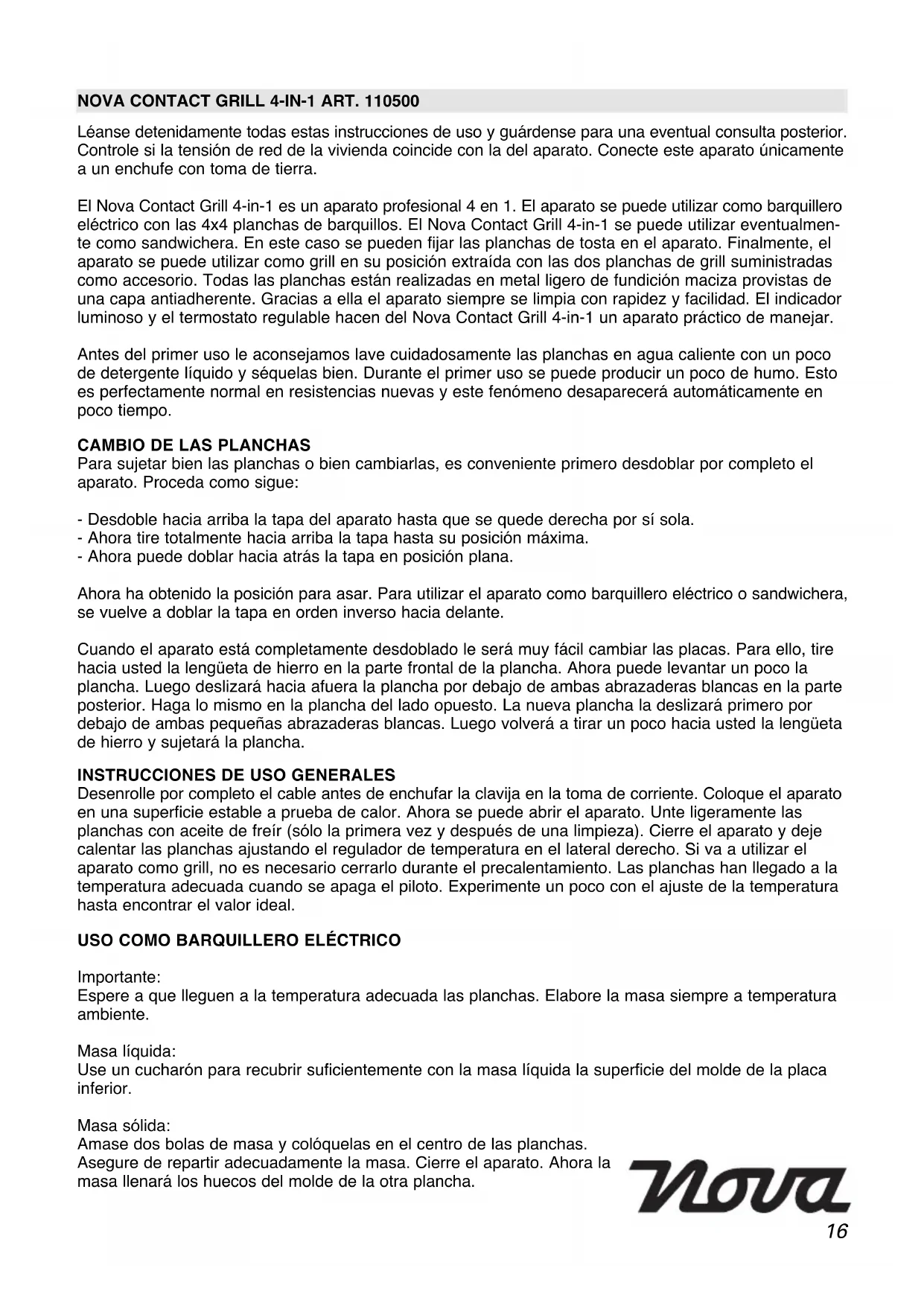 Léanse detenidamente todas estas instrucciones de uso y guárdense para una eventual consulta posterior. Controle si la tensión de red de la vivienda coincide con la del aparato. Conecte este aparato únicamente a un enchufe con toma de tierra. El Nova Contact Grill 4-in-1 es un aparato profesional 4 en 1. El aparato se puede utilizar como barquillero eléctrico con las 4x4 planchas de barquillos. El Nova Contact Grill 4-in-1 se puede utilizar eventualmen- te como sandwichera. En este caso se pueden fijar las planchas de tosta en el aparato. Finalmente, el aparato se puede utilizar como grill en su posición extraída con las dos planchas de grill suministradas como accesorio. Todas las planchas están realizadas en metal ligero de fundición maciza provistas de una capa antiadherente. Gracias a ella el aparato siempre se limpia con rapidez y facilidad. El indicador luminoso y el termostato regulable hacen del Nova Contact Grill 4-in-1 un aparato práctico de manejar. Antes del primer uso le aconsejamos lave cuidadosamente las planchas en agua caliente con un poco de detergente líquido y séquelas bien. Durante el primer uso se puede producir un poco de humo. Esto es perfectamente normal en resistencias nuevas y este fenómeno desaparecerá automáticamente en poco tiempo.