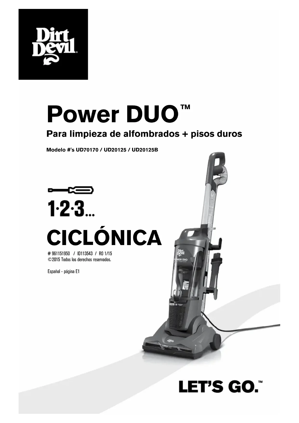 Para limpieza de alfombrados + pisos duros CICLÓNICA # 961151950 / ID113543 / R0 1/15 ©2015 Todos los derechos reservados. Español - página E1 Modelo #'s UD70170 / UD20125 / UD20125BHOLA. BIENVENIDO. REGISTRO DEL PRODUCTO Para poder consultar rápidamente, anote la información de su producto a continuación. N. ° de modelo: Cód. de fabricación: (El cód. de fabricación ubicado en el reverso del producto o en su base.) Registro de la garantía Asegúrese de registrar su producto en línea, en el sitio www. DirtDevil.com, o comuníquese al 1-800-321-1134 para realizar el registro telefónicamente. Consejo: Adjunte su recibo de compra a este Manual del propietario. Puede que le soliciten la fecha de compra para obtener el servicio de la garantía de su producto Dirt Devil