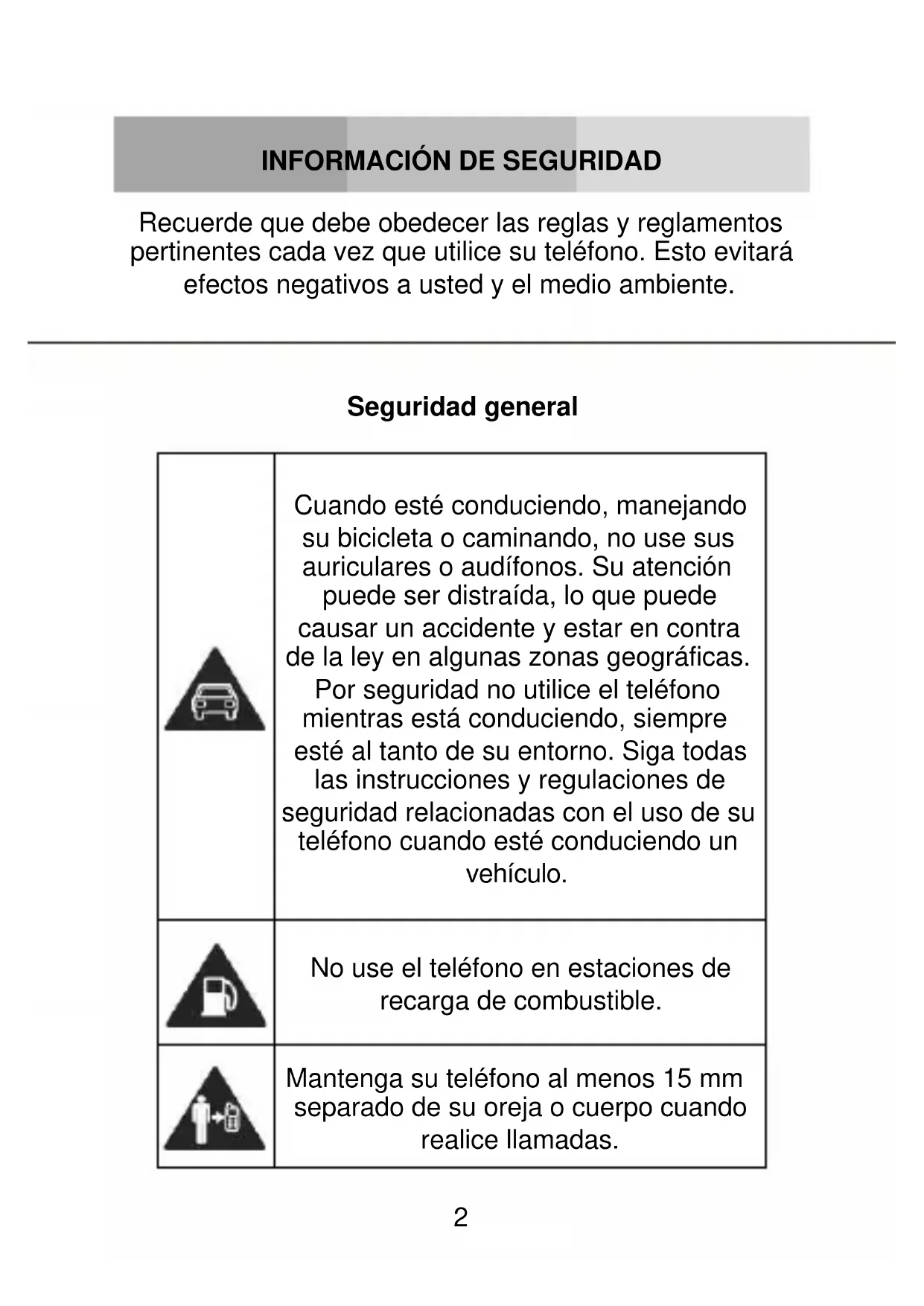 Cuando esté conduciendo, manejando su bicicleta o caminando, no use sus auriculares o audífonos. Su atención puede ser distraída, lo que puede causar un accidente y estar en contra de la ley en algunas zonas geográficas. Por seguridad no utilice el teléfono mientras está conduciendo, siempre esté al tanto de su entorno. Siga todas las instrucciones y regulaciones de seguridad relacionadas con el uso de su teléfono cuando esté conduciendo un vehículo.