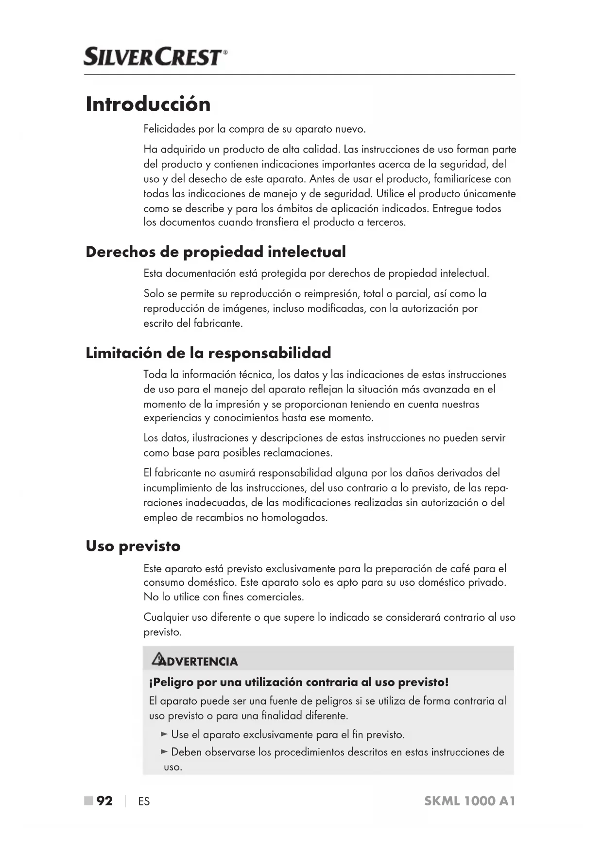 ES SKML 1000 A1 Introducción Felicidades por la compra de su aparato nuevo. Ha adquirido un producto de alta calidad. Las instrucciones de uso forman parte del producto y contienen indicaciones importantes acerca de la seguridad, del uso y del desecho de este aparato. Antes de usar el producto, familiarícese con todas las indicaciones de manejo y de seguridad. Utilice el producto únicamente como se describe y para los ámbitos de aplicación indicados. Entregue todos los documentos cuando transfiera el producto a terceros. Derechos de propiedad intelectual Esta documentación está protegida por derechos de propiedad intelectual. Solo se permite su reproducción o reimpresión, total o parcial, así como la reproducción de imágenes, incluso modificadas, con la autorización por escrito del fabricante. Limitación de la responsabilidad Toda la información técnica, los datos y las indicaciones de estas instrucciones de uso para el manejo del aparato reflejan la situación más avanzada en el momento de la impresión y se proporcionan teniendo en cuenta nuestras experiencias y conocimientos hasta ese momento. Los datos, ilustraciones y descripciones de estas instrucciones no pueden servir como base para posibles reclamaciones. El fabricante no asumirá responsabilidad alguna por los daños derivados del incumplimiento de las instrucciones, del uso contrario a lo previsto, de las repa- raciones inadecuadas, de las modificaciones realizadas sin autorización o del empleo de recambios no homologados. Uso previsto Este aparato está previsto exclusivamente para la preparación de café para el consumo doméstico. Este aparato solo es apto para su uso doméstico privado. No lo utilice con fines comerciales. Cualquier uso diferente o que supere lo indicado se considerará contrario al uso previsto. ADVERTENCIA ¡Peligro por una utilización contraria al uso previsto! El aparato puede ser una fuente de peligros si se utiliza de forma contraria al uso previsto o para una finalidad diferente. ► Use el aparato exclusivamente para el fin previsto. ► Deben observarse los procedimientos descritos en estas instrucciones de uso.ES