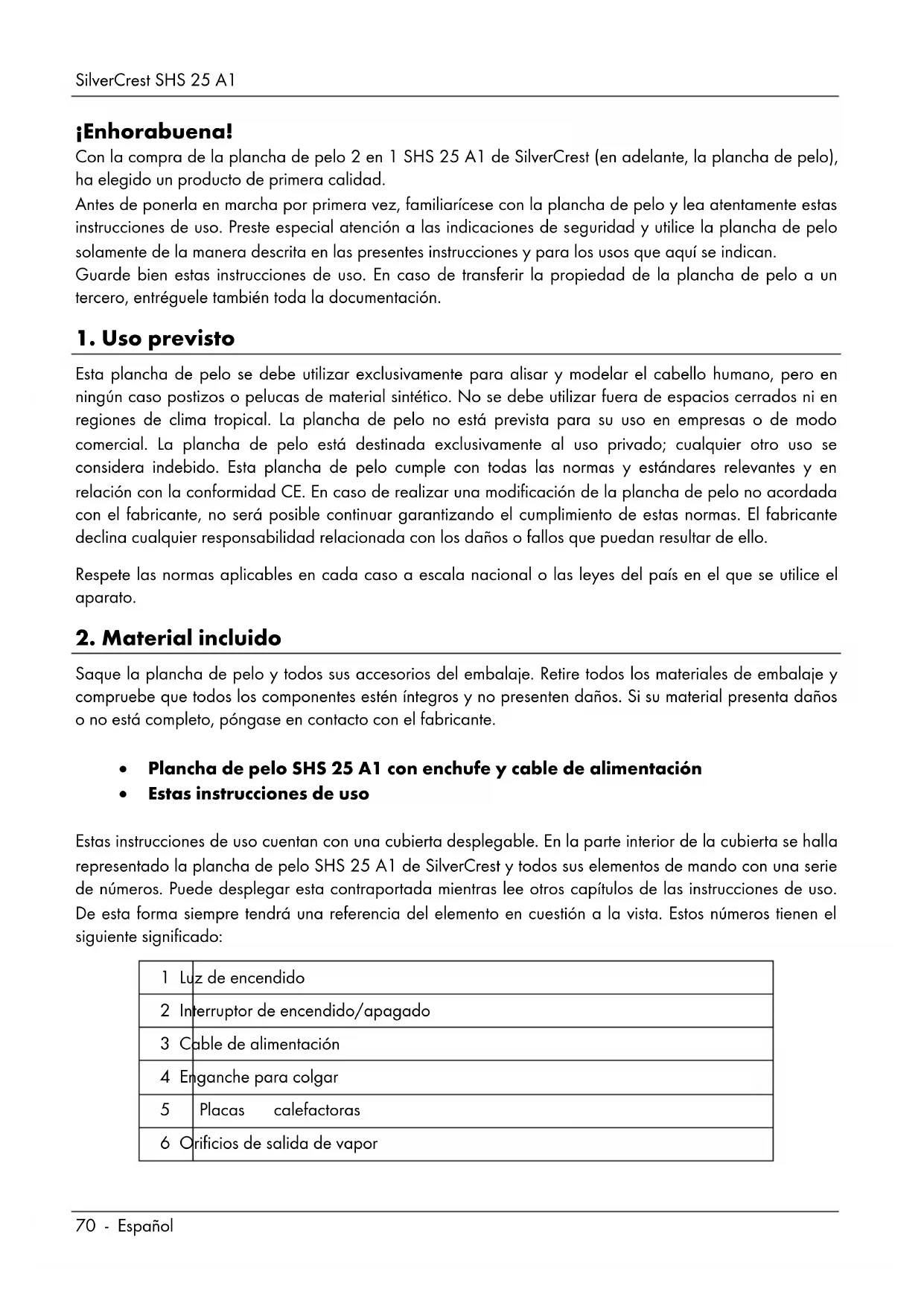Estas instrucciones de uso@cuentan con una cubierta desplegable. En la parte interior de la cubierta se Halla representado la plancha de polo SHS 25 A1 de SilverCrest y todos sus elementos de mando con una series de numeros. Puede desplegar esta contraportada,michas leo otros capitudes de las instrucciones de uso. De this forma siempre tendr a reference del elemento en cuestion a la vista. Estosnumeros tener el,. seguiente significado:
