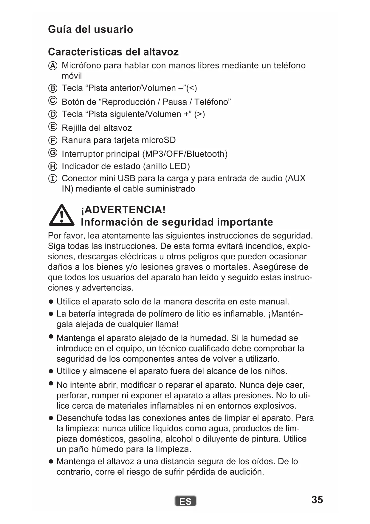 Conector mini USB para la carga y para entrada de audio (AUX IN) mediante el cable suministrado ¡ADVERTENCIA! Información de seguridad importante Por favor, lea atentamente las siguientes instrucciones de seguridad. Siga todas las instrucciones. De esta forma evitará incendios, explo- siones, descargas eléctricas u otros peligros que pueden ocasionar daños a los bienes y/o lesiones graves o mortales. Asegúrese de que todos los usuarios del aparato han leído y seguido estas instruc- ciones y advertencias.