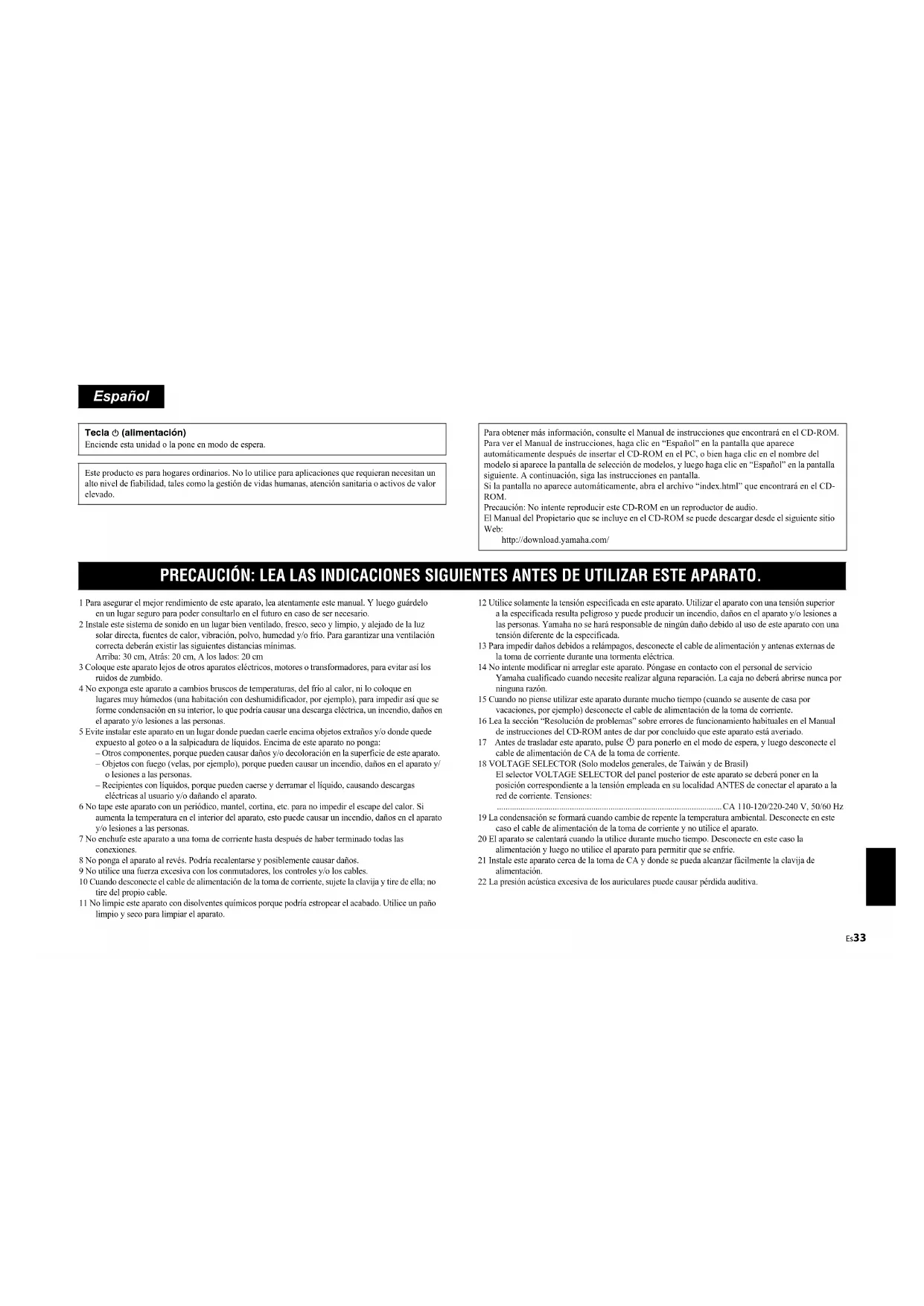 12 Utilice solamente la tensión especificada en este aparato. Utilizar el aparato con una tensión superior a la especificada resulta peligroso y puede producir un incendio, daños en el aparato y/o lesiones a las personas. Yamaha no se hará responsable de ningún daño debido al uso de este aparato con una tensión diferente de la especificada.