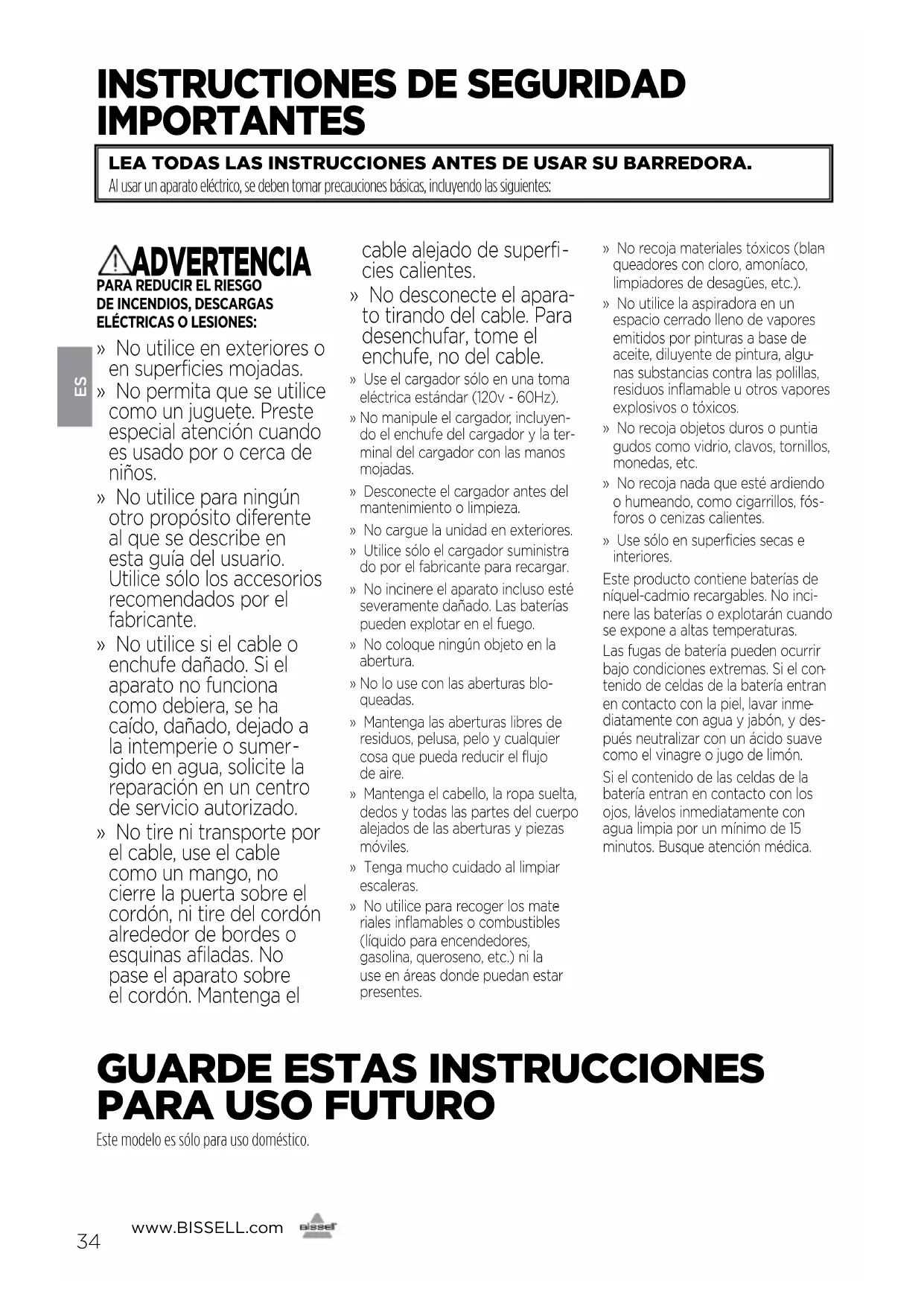 diatamente con agua y jabón, y des- pués neutralizar con un ácido suave como el vinagre o jugo de limón. Si el contenido de las celdas de la batería entran en contacto con los ojos, lávelos inmediatamente con agua limpia por un mínimo de 15 minutos. Busque atención médica. LEA TODAS LAS INSTRUCCIONES ANTES DE USAR SU BARREDORA. Al usar un aparato eléctrico, se deben tomar precauciones básicas, incluyendo las siguientes: Este modelo es sólo para uso doméstico.