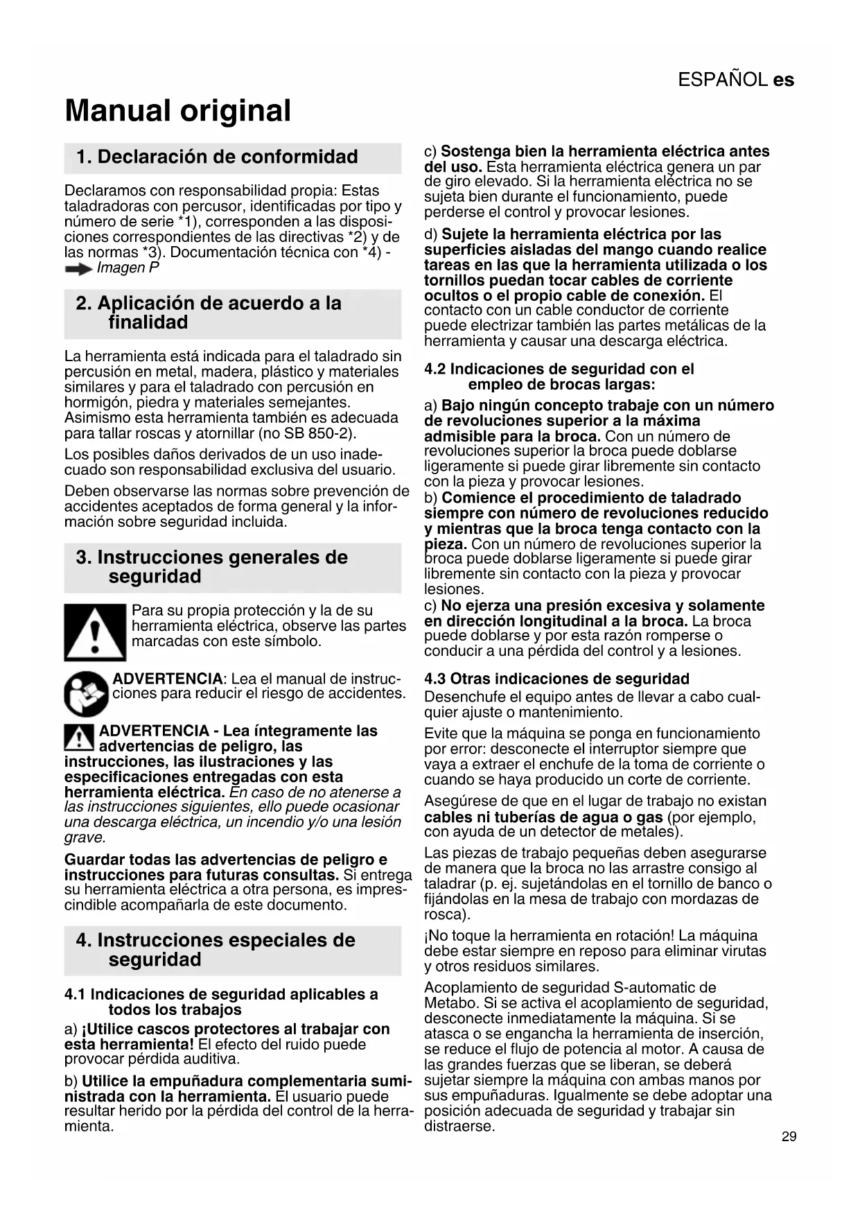 Acoplamiento de seguridad S-automatic de Metabo. Si se activa el acoplamiento de seguridad, desconecte inmediatamente la máquina. Si se atasca o se engancha la herramienta de inserción, se reduce el flujo de potencia al motor. A causa de las grandes fuerzas que se liberan, se deberá sujetar siempre la máquina con ambas manos por sus empuñaduras. Igualmente se debe adoptar una posición adecuada de seguridad y trabajar sin distraerse.