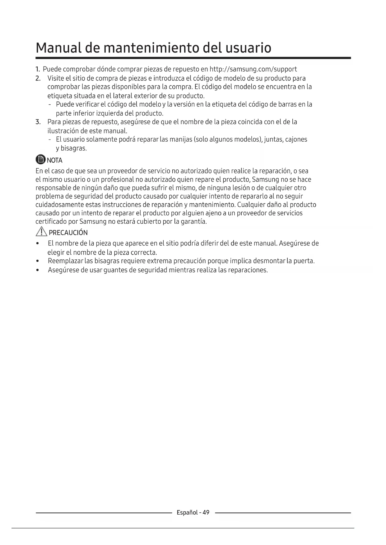 ilustración de este manual. ‐ El usuario solamente podrá reparar las manijas (solo algunos modelos), juntas, cajones ybisagras. NOTA En el caso de que sea un proveedor de servicio no autorizado quien realice la reparación, o sea el mismo usuario o un profesional no autorizado quien repare el producto, Samsung no se hace responsable de ningún daño que pueda sufrir el mismo, de ninguna lesión o de cualquier otro problema de seguridad del producto causado por cualquier intento de repararlo al no seguir cuidadosamente estas instrucciones de reparación y mantenimiento. Cualquier daño al producto causado por un intento de reparar el producto por alguien ajeno a un proveedor de servicios certificado por Samsung no estará cubierto por la garantía. PRECAUCIÓN