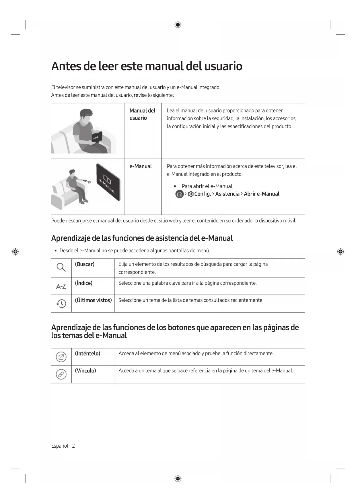 - Para abrir el e-Manual, > Cong. > Asistencia > Abrir e-Manual Puede descargarse el manual del usuario desde el sitio web y leer el contenido en su ordenador o dispositivo móvil. Aprendizaje de las funciones de asistencia del e-Manual