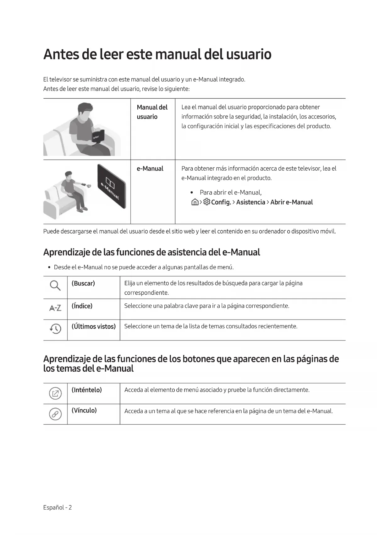 - Para abrir el e-Manual, > Cong. > Asistencia > Abrir e-Manual Puede descargarse el manual del usuario desde el sitio web y leer el contenido en su ordenador o dispositivo móvil. Aprendizaje de las funciones de asistencia del e-Manual