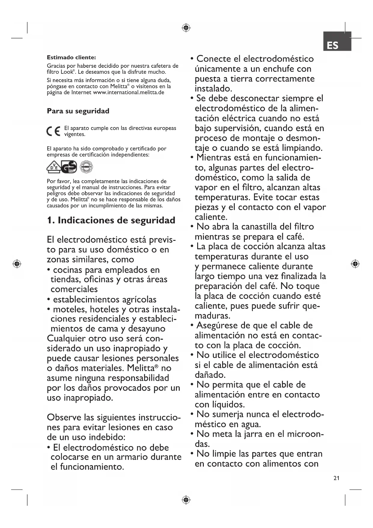 El aparato cumple con las directivas europeas vigentes. El aparato ha sido comprobado y certificado por empresas de certificación independientes: Por favor, lea completamente las indicaciones de seguridad y el manual de instrucciones. Para evitar peligros debe observar las indicaciones de seguridad y de uso. Melitta