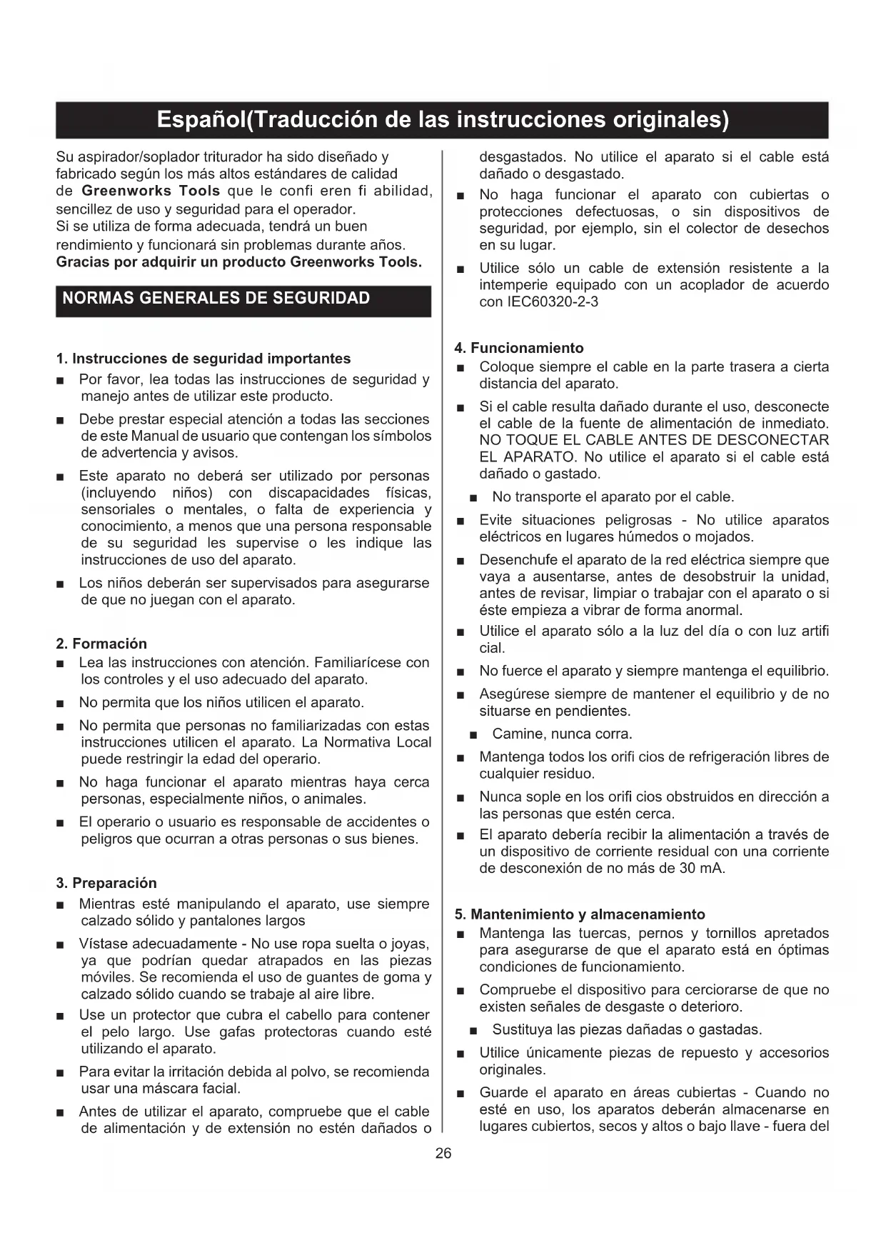 Español(Traducción de las instrucciones originales) MONTAJE DESEMBALAJE ■ Retire con cuidado el producto y los accesorios de la caja. ■ Revise el producto con atención para asegurarse de que no se produjeron daños o roturas durante el transporte. ■ No tire el material de embalaje hasta que haya revisado con atención y haya utilizado el producto de manera satisfactoria. ■ Si cualquier pieza está dañada llame al centro de servicio autorizado Greenworks Tools de su localidad. El aspirador/soplador se suministra con algunos componentes sin ensamblar. Para montarlos, haga lo siguiente: MONTAJE COMO UNA TRITURADORA (Fig. 2) ■ Deslice los tubos frontal y trasero de la trituradora hasta que se unan. (Véase la figura 2). ■ Pulse el botón de bloqueo hacia delante para soltar la puerta. Mantenga la puerta abierta. (Véase la figura 2,1). ■ Introduzca el clip con la punta “cuneiforme” de la trituradora en el clip trasero. (Véase la figura 2.2). Empuje el clip con la punta en forma de “gancho” del tubo de la trituradora dentro del clip frontal. (Véase la figura 2,3). Pulse de nuevo el botón de bloqueo para enganchar el tubo de la trituradora. (Véase la figura 2,4). ■ Para retirar los tubos de la trituradora siga los pasos (3) (2) (1). ■ Introduzca el adaptador de la bolsa en la salida del soplador. Bloquee el adaptador de la bolsa con el botón de bloqueo. Para retirar la bolsa simplemente pulse el botón de bloqueo y retírela. (Véase la figura 4) NOTA: Podría ser necesario retirar el tubo del soplador o los tubos de la trituradora para desatascar un impulsor o tubo de bloqueo. ADVERTENCIA: Para evitar lesiones físicas graves asegúrese de que el interruptor está en posición OFF (apagado), desenchufado, y que los impulsores han parado antes de colocar o retirar tubos. MONTAJE COMO UN SOPLADOR (Fig. 3) ■ Deslice el tubo del soplador hacia delante hasta que las zonas dentadas de la cubierta del soplador encajan en las ranuras del tubo. INSTALACIÓN DE LA BOLSA CON ARNÉS PARA LOS HOMBROS (Fig. 4) ■ Mientras está de pie en la posición de manejo ajuste la largura que se adapte al tamaño del operador. Empuje la lengüeta para alargar y la correa para acortar. FUNCIONAMIENTO CONEXIÓN DE CABLE DE ALIMENTACIÓN (Fig. 5) ■ Asegure el cable de extensión a la carcasa del motor utilizando la hendidura en la parte trasera del soplador. Esto evitará que el cable eléctrico se retire de forma accidental. ■ Enchufe el extremo hembra al cable eléctrico en la toma que está en la parte trasera de la unidad. ARRANCAR/PARAR EL SOPLADOR/LA TRITURADORA (Fig. 6) ■ Para encenderla: Pulse el interruptor y póngalo en la posición ON (encendido). ■ Gire el dial hacia delante para aumentar la velocidad. ■ Para apagarla: Pulse el interruptor y póngalo en la posición OFF (apagado). IMPORTANTE: Mientras está en modo de trituración el soplador DEBE estar en la posición de alta velocidad.