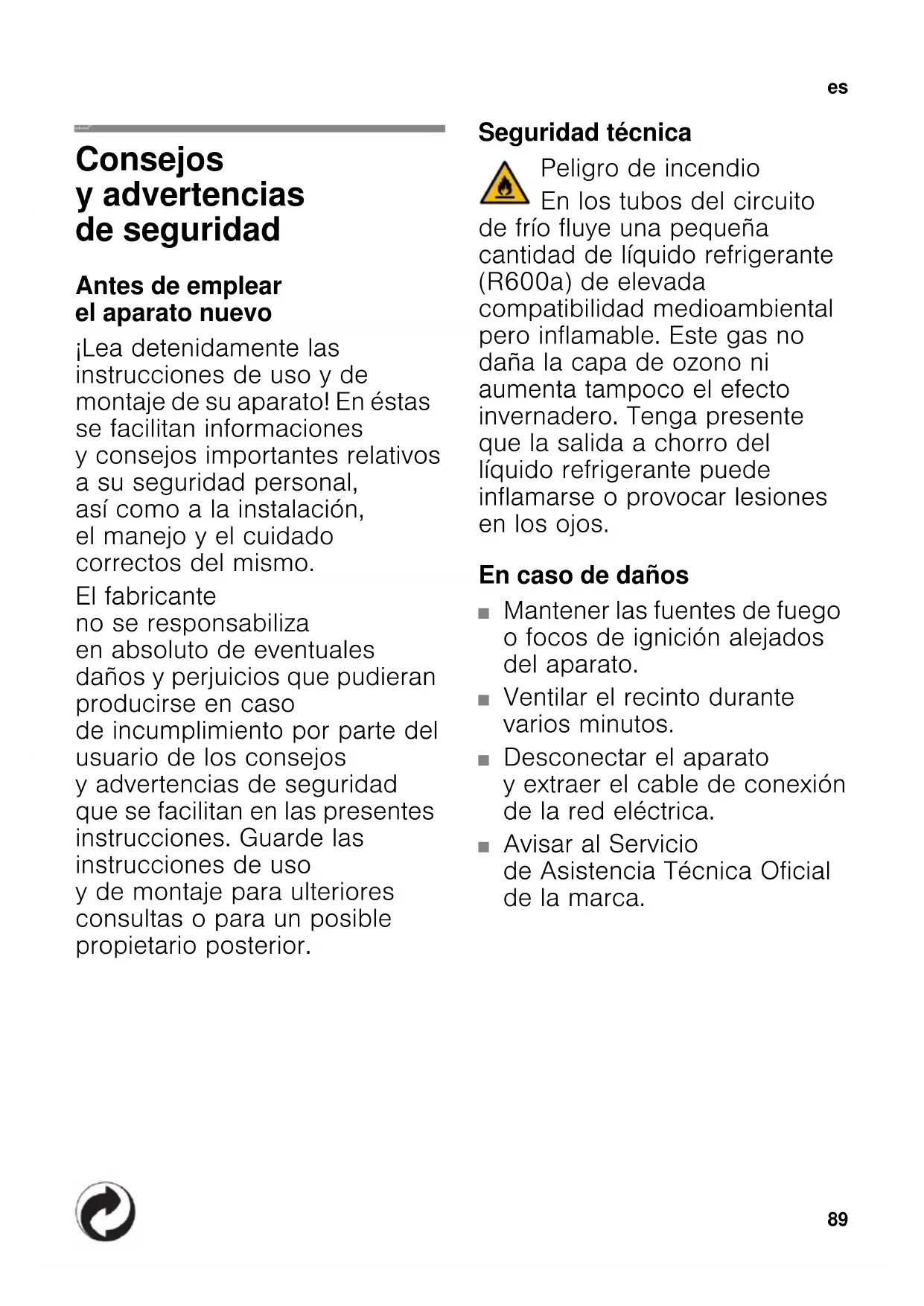 esÍndice esInstrucciones de uso Consejos y advertencias de seguridad Antes de emplear el aparato nuevo ¡Lea detenidamente las instrucciones de uso y de montaje de su aparato! En éstas se facilitan informaciones y consejos importantes relativos a su seguridad personal, así como a la instalación, el manejo y el cuidado correctos del mismo. El fabricante no se responsabiliza en absoluto de eventuales daños y perjuicios que pudieran producirse en caso de incumplimiento por parte del usuario de los consejos y advertencias de seguridad que se facilitan en las presentes instrucciones. Guarde las instrucciones de uso y de montaje para ulteriores consultas o para un posible propietario posterior. Seguridad técnica Peligro de incendio En los tubos del circuito de frío fluye una pequeña cantidad de líquido refrigerante (R600a) de elevada compatibilidad medioambiental pero inflamable. Este gas no daña la capa de ozono ni aumenta tampoco el efecto invernadero. Tenga presente que la salida a chorro del líquido refrigerante puede inflamarse o provocar lesiones en los ojos. En caso de daños ■ Mantener las fuentes de fuego o focos de ignición alejados del aparato. ■ Ventilar el recinto durante varios minutos. ■ Desconectar el aparato y extraer el cable de conexión de la red eléctrica. ■ Avisar al Servicio de Asistencia Técnica Oficial de la marca.es