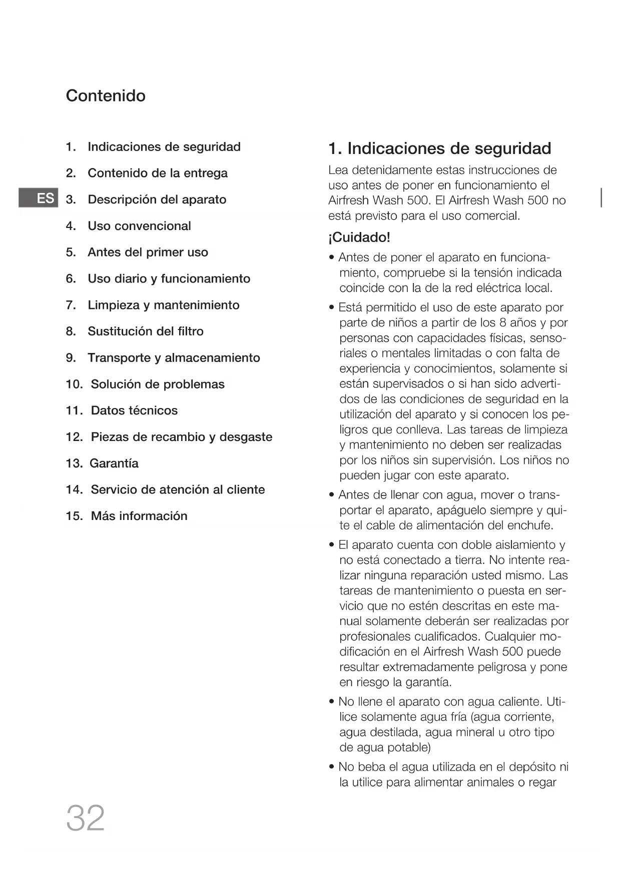 Lea detenidamente estas instrucciones de uso antes de poner en funcionamiento el Airfresh Wash 500. El Airfresh Wash 500 no está previsto para el uso comercial. ¡Cuidado!