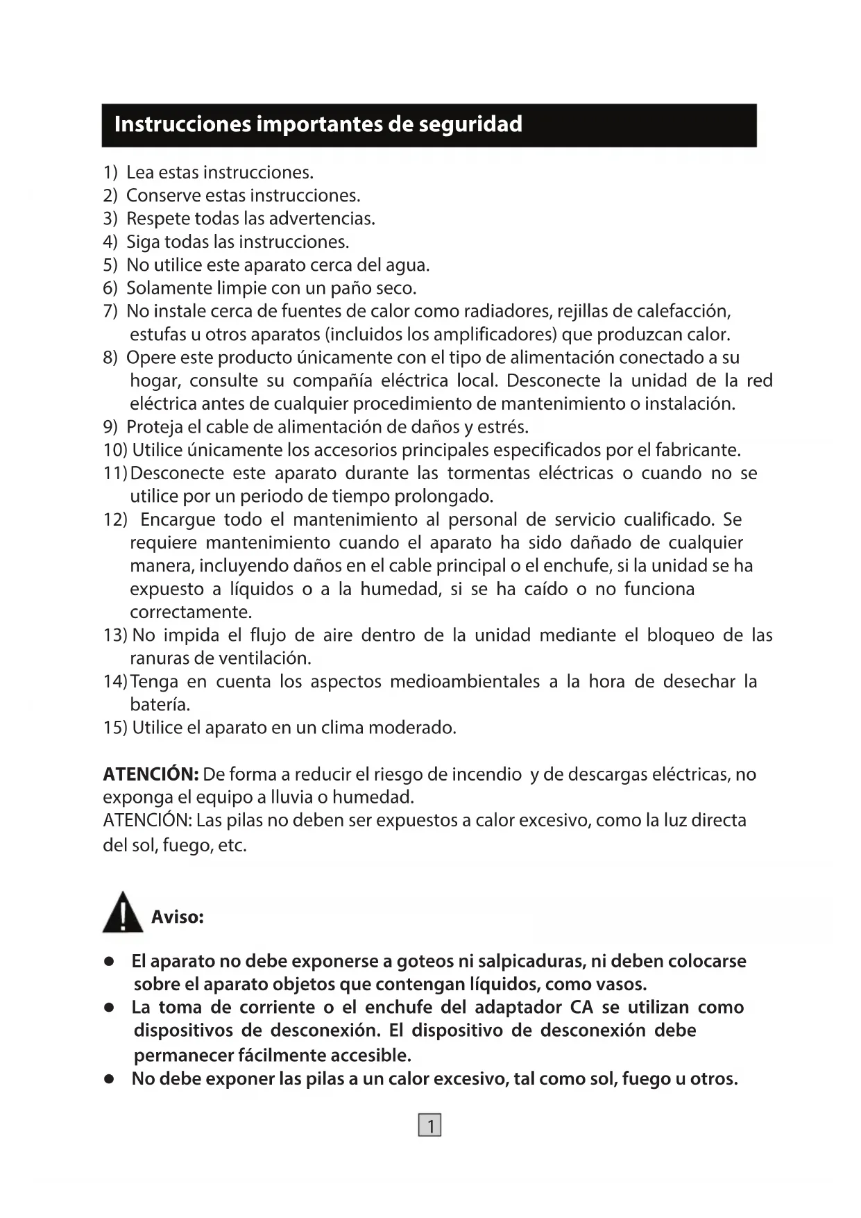 12) Encargue todo el mantenimiento al personal de servicios@cualificado. Se requiresistmentimiento cuando el aparato ha sido dañado de qualquier manera, incluyendo daños en el cable principal o el enchufe, si la unidad se ha expuesto a liquidos o a la humedad, si se ha caido o no funcionacorrectamente.