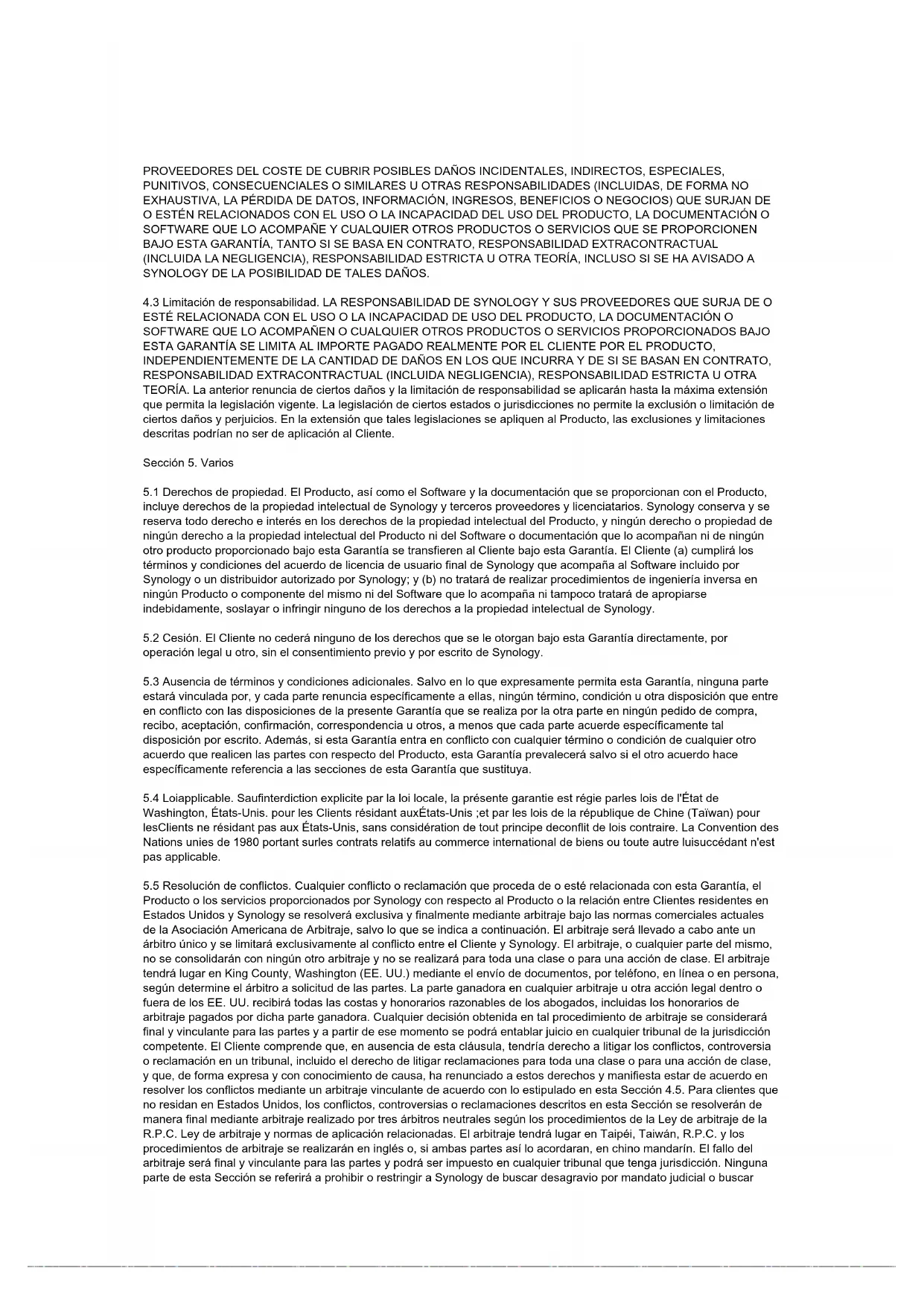 4.3 Limitación de responsabilidad. LA RESPONSABILIDAD DE SYNOLOGY Y SUS PROVEEDORES QUE SURJA DE O