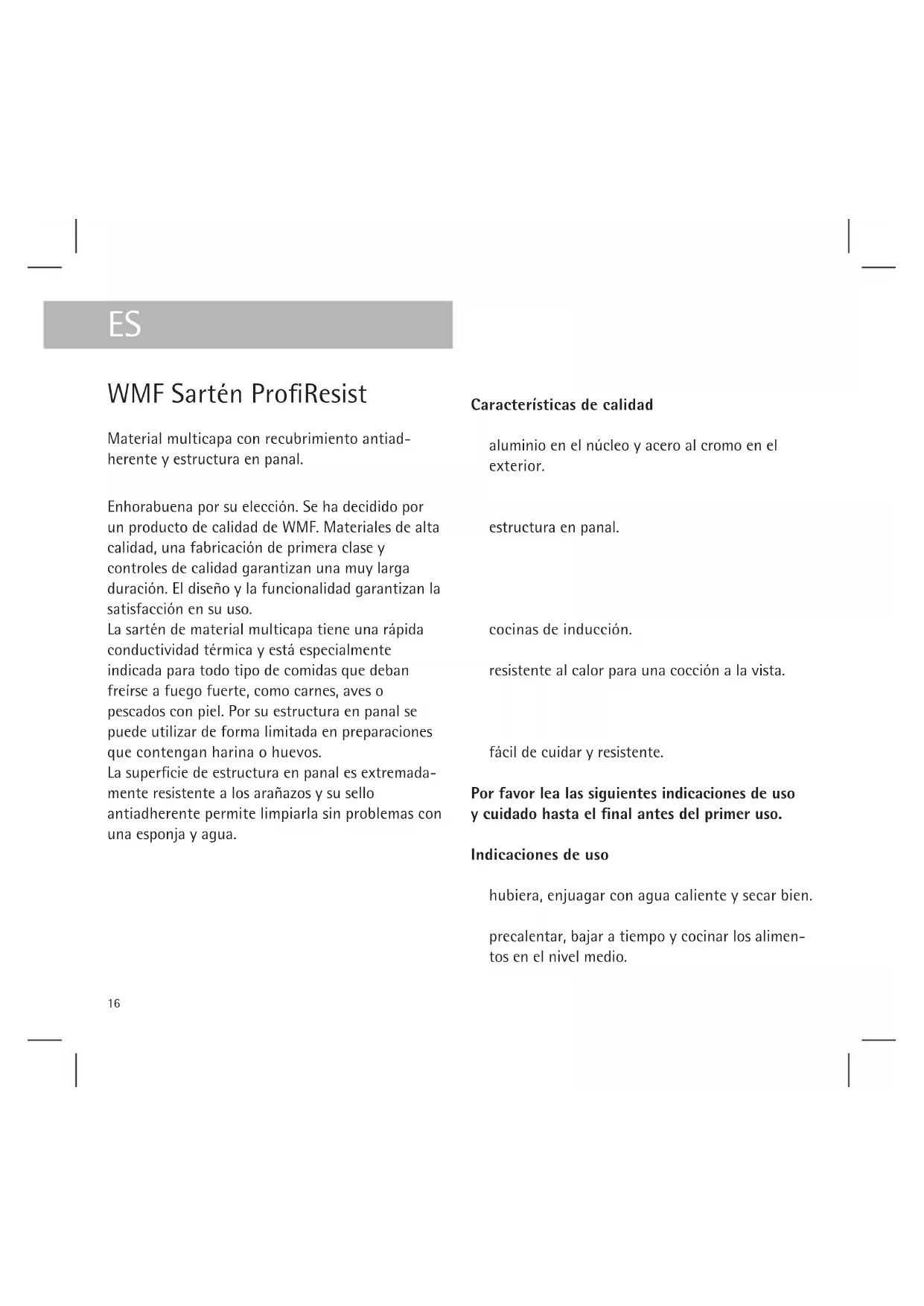 - Utilisation de pièces de rechange non d‘origine La demande de garantie est à adresser directement au siège du garant ou à un revendeur autorisé WMF. Bon de garantie Les poêles sont fabriquées par des professionnels compétents et selon les procédés de fabrication les plus modernes. Conformément aux dispositions énoncées ci-dessus, WMF accorde 5 ans de garantie. En cas de réclamation, prière de retourner la poêles accompagnée du bon de garantie dûment rempli par le revendeur WMF. 15WMF Sartén ProfiResist Material multicapa con recubrimiento antiad- herente y estructura en panal. Enhorabuena por su elección. Se ha decidido por un producto de calidad de WMF. Materiales de alta calidad, una fabricación de primera clase y controles de calidad garantizan una muy larga duración. El diseño y la funcionalidad garantizan la satisfacción en su uso. La sartén de material multicapa tiene una rápida conductividad térmica y está especialmente indicada para todo tipo de comidas que deban freírse a fuego fuerte, como carnes, aves o pescados con piel. Por su estructura en panal se puede utilizar de forma limitada en preparaciones que contengan harina o huevos. La superficie de estructura en panal es extremada- mente resistente a los arañazos y su sello antiadherente permite limpiarla sin problemas con una esponja y agua. Características de calidad