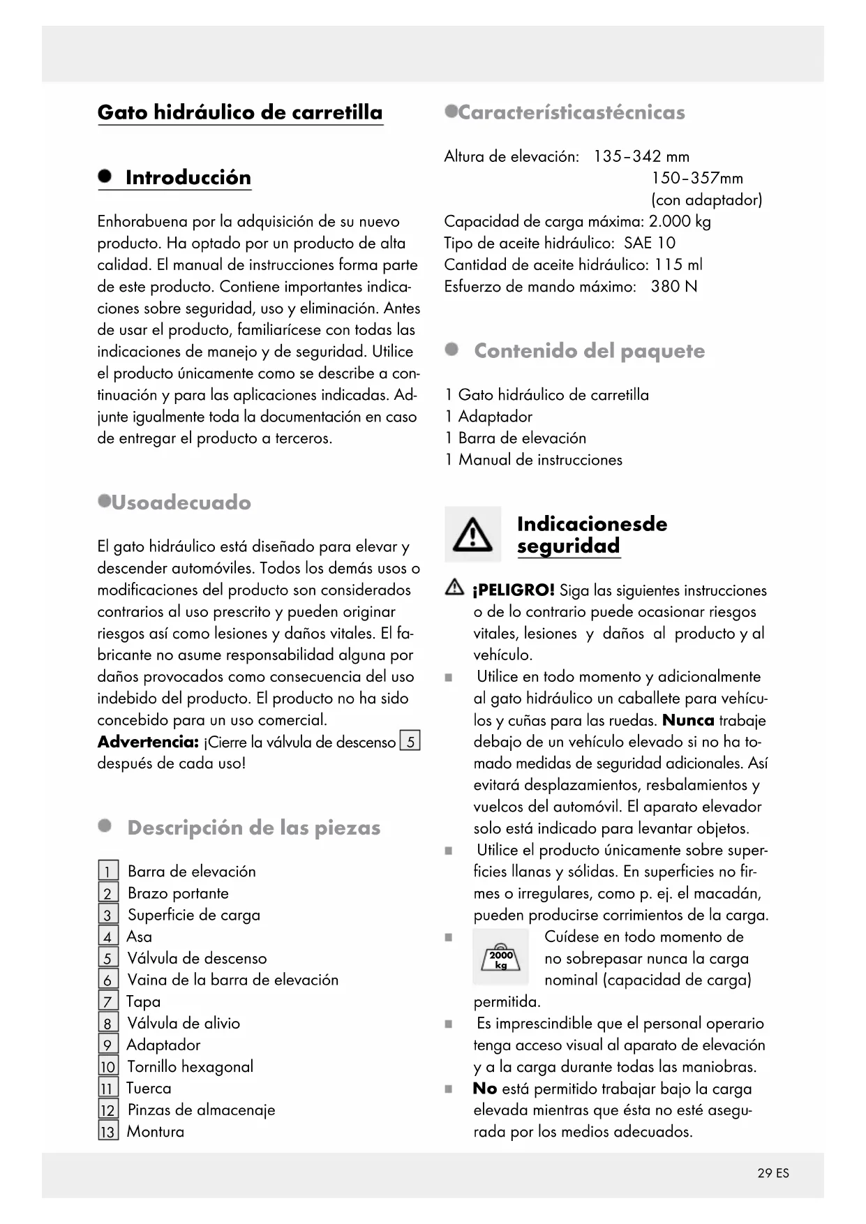 Montura Características técnicas Altura de elevación: 135–342 mm 150–357 mm (con adaptador) Capacidad de carga máxima: 2.000 kg Tipo de aceite hidráulico: SAE 10 Cantidad de aceite hidráulico: 115 ml Esfuerzo de mando máximo: 380 N Contenido del paquete 1 Gato hidráulico de carretilla 1 Adaptador 1 Barra de elevación 1 Manual de instrucciones Indicaciones de seguridad ¡PELIGRO! Siga las siguientes instrucciones o de lo contrario puede ocasionar riesgos vitales, lesiones y daños al producto y al vehículo. Utilice en todo momento y adicionalmente al gato hidráulico un caballete para vehícu- los y cuñas para las ruedas. Nunca trabaje debajo de un vehículo elevado si no ha to- mado medidas de seguridad adicionales. Así evitará desplazamientos, resbalamientos y vuelcos del automóvil. El aparato elevador solo está indicado para levantar objetos. Utilice el producto únicamente sobre super- ficies llanas y sólidas. En superficies no fir- mes o irregulares, como p. ej. el macadán, pueden producirse corrimientos de la carga.