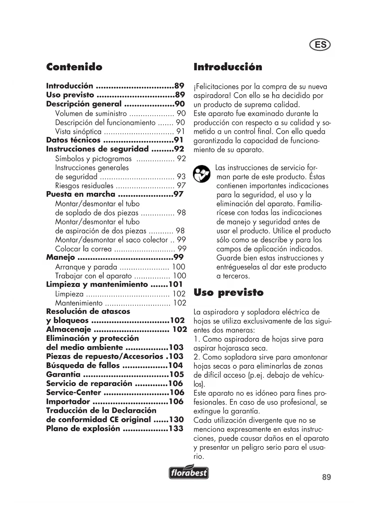 hojas secas o para eliminarlas de zonas de difícil acceso (p.ej. debajo de vehícu- los). Este aparato no es idóneo para nes pro- fesionales. En caso de uso profesional, se extingue la garantía. Cada utilización divergente que no se menciona expresamente en estas instruc- ciones, puede causar daños en el aparato y presentar un peligro serio para el usua- rio. Traducción de la Declaración de conformidad CE original ......130 Plano de explosión ..................13390
