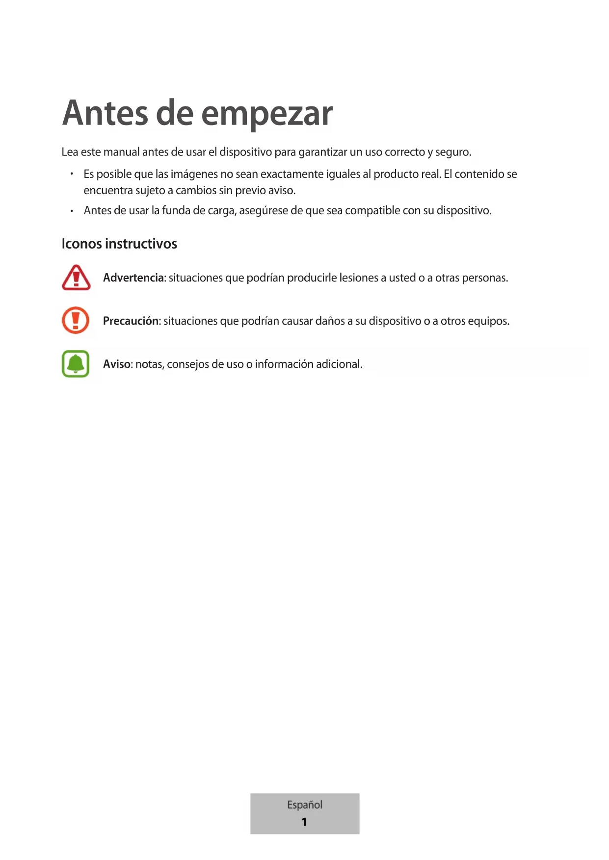 Antes de usar la funda de carga, asegúrese de que sea compatible con su dispositivo. Iconos instructivos Advertencia: situaciones que podrían producirle lesiones a usted o a otras personas. Precaución: situaciones que podrían causar daños a su dispositivo o a otros equipos. Aviso: notas, consejos de uso o información adicional. Español