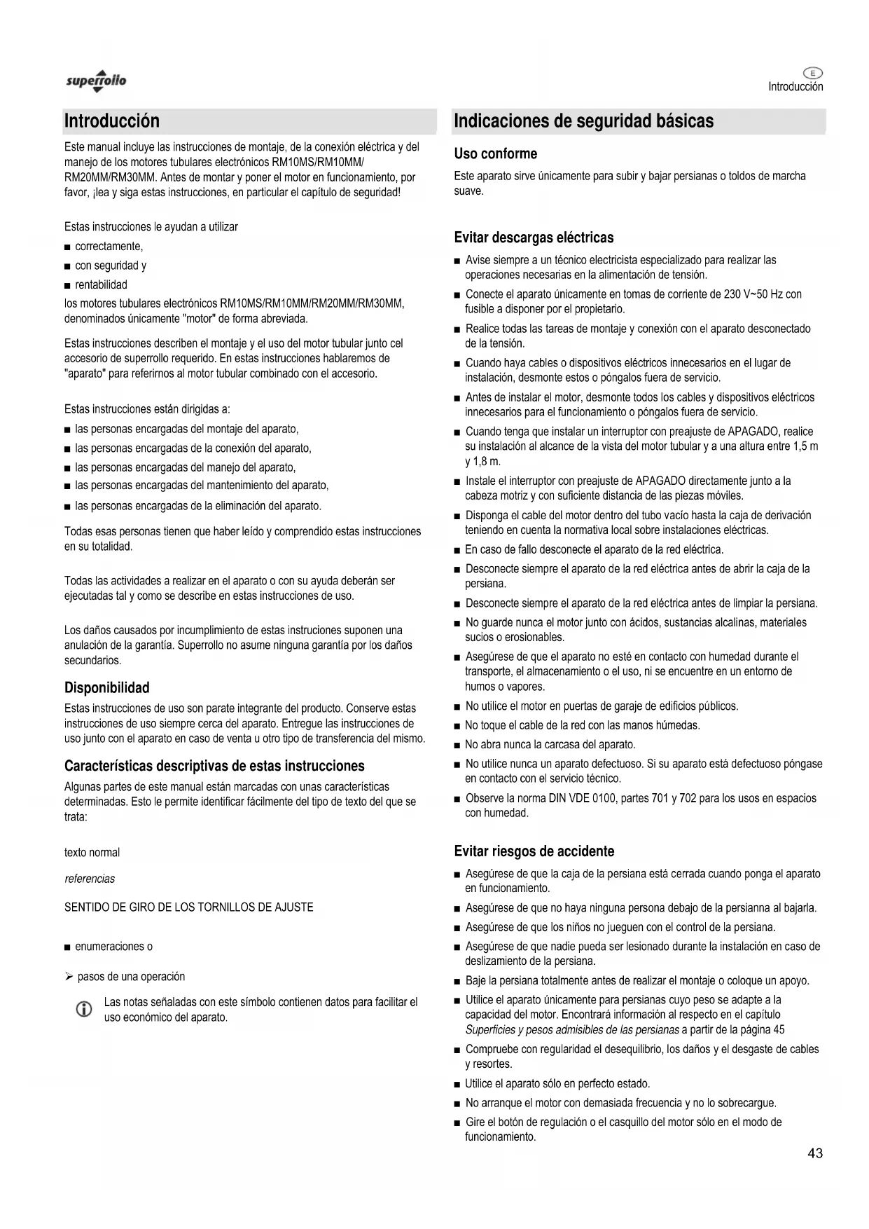 Este manual incluye las instrucciones de montaje, de la conexión eléctrica y del manejo de los motores tubulares electrónicos RM10MS/RM10MM/RM20MM/RM30MM. Antes de montar y poner el motor en funcionamiento, por favor, ¡lea y siga estas instrucciones, en particular el capítulo de seguridad!