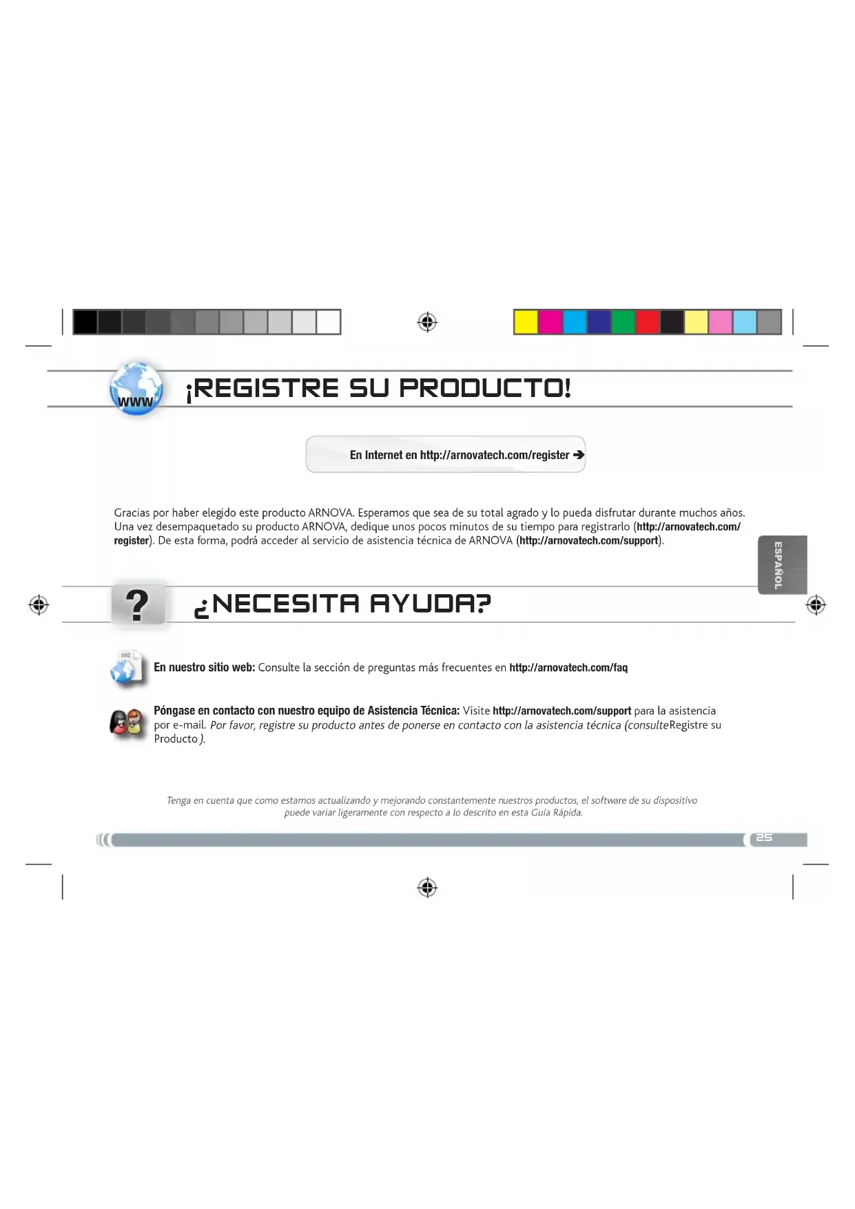 EsPaÑOl ÜBERtRagEN voN mEDiaDatEiEN ¡REgistRE su PRoDucto! Gracias por haber elegido este producto ARNOVA. Esperamos que sea de su total agrado y lo pueda disfrutar durante muchos años. Una vez desempaquetado su producto ARNOVA, dedique unos pocos minutos de su tiempo para registrarlo (http://arnovatech.com/ register). De esta forma, podrá acceder al servicio de asistencia técnica de ARNOVA (http://arnovatech.com/support). En Internet en http://arnovatech.com/register Ä ¿NEcEsita ayuDa? Tenga en cuenta que como estamos actualizando y mejorando constantemente nuestros productos, el software de su dispositivo puede variar ligeramente con respecto a lo descrito en esta Guía Rápida. En nuestro sitio web: Consulte la sección de preguntas más frecuentes en http://arnovatech.com/faq Póngase en contacto con nuestro equipo de Asistencia Técnica: Visite http://arnovatech.com/support para la asistencia por e-mail. Por favor, registre su producto antes de ponerse en contacto con la asistencia técnica (consulte Registre su Producto ).26