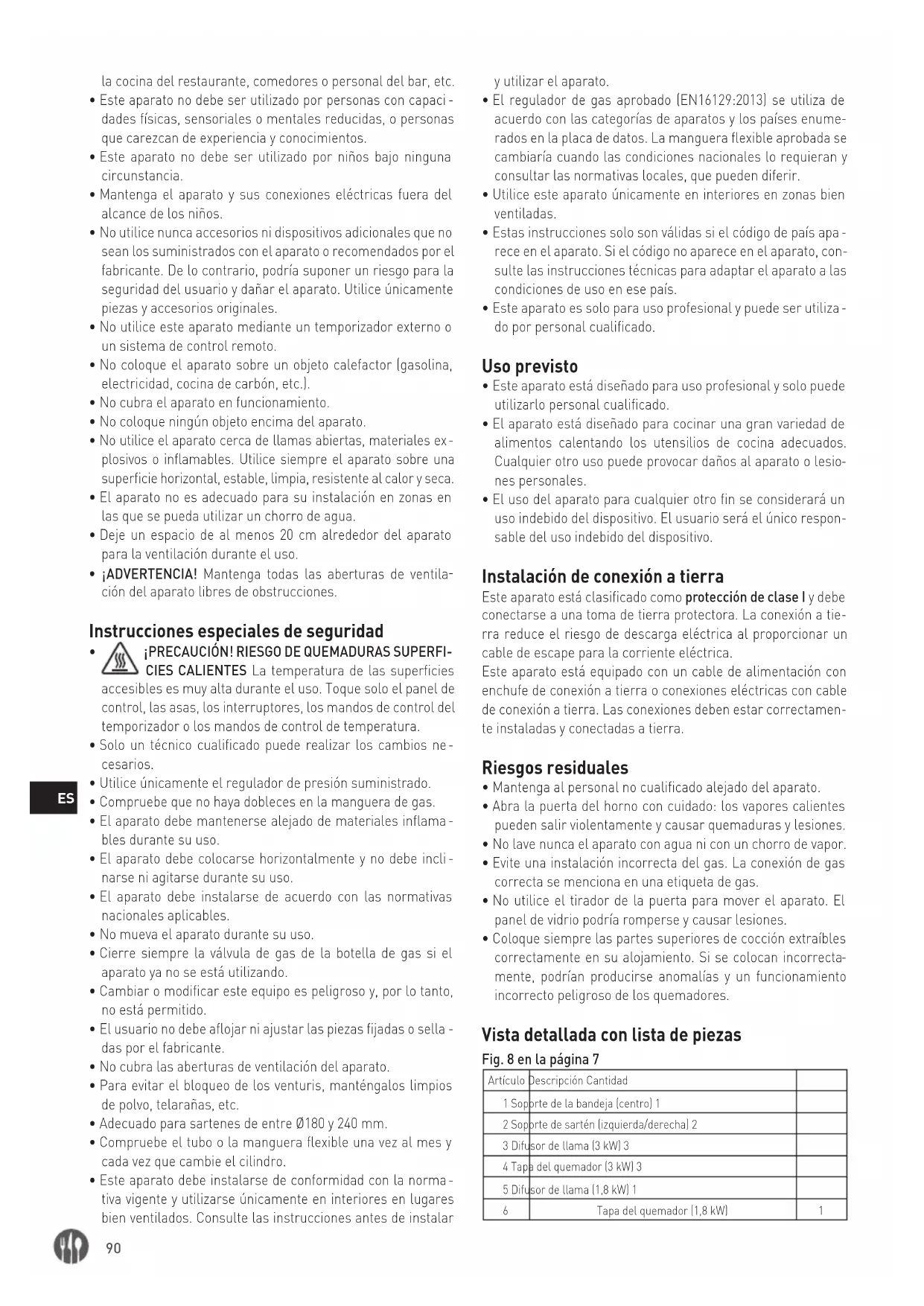 mente, podrían producirse anomalías y un funcionamiento incorrecto peligroso de los quemadores. Vista detallada con lista de piezas Fig. 8 en la página 7 Artículo Descripción Cantidad 1 Soporte de la bandeja (centro) 1 2 Soporte de sartén (izquierda/derecha) 2 3 Difusor de llama (3 kW) 3 4 Tapa del quemador (3 kW) 3 5 Difusor de llama (1,8 kW) 1 6 Tapa del quemador (1,8 kW) 191