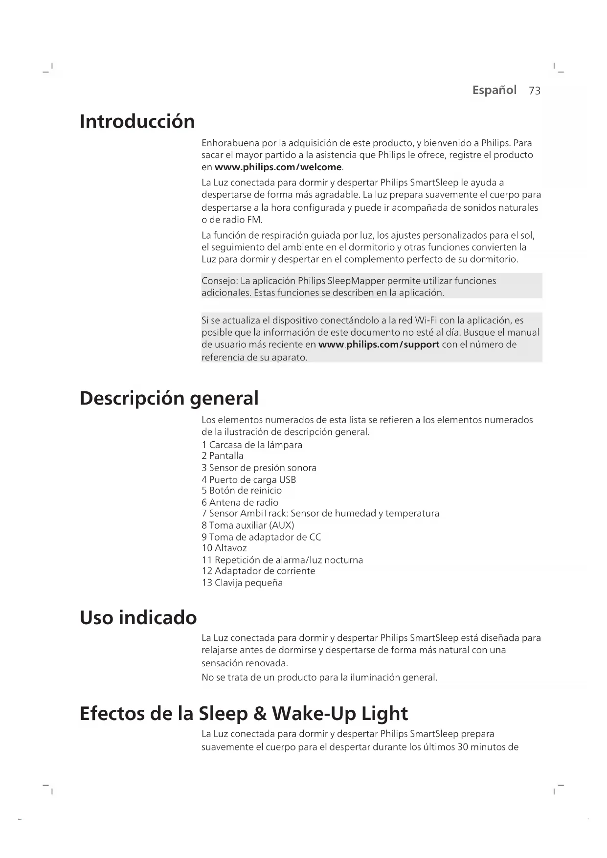 Español Contenido Introducción _____________________________________________________________________________ 73 Descripción general________________________________________________________________________ 73 Uso indicado______________________________________________________________________________ 73 Efectos de la Sleep & Wake-Up Light _________________________________________________________ 73 Información de seguridad importante________________________________________________________ 74 Seguridad y cumplimiento__________________________________________________________________ 76 Campos electromagnéticos (CEM) ___________________________________________________________ 76 Iconos de menú interactivos ________________________________________________________________ 76 Conexión del aparato a una red Wi-Fi ________________________________________________________ 77 Navegación por el menú ___________________________________________________________________ 78 Ajuste de los perfiles de despertar ___________________________________________________________ 79 Hora + respaldo de alarma__________________________________________________________________ 80 Alarma diferida ___________________________________________________________________________ 81 Descarte de la alarma ______________________________________________________________________ 81 Uso del aparato como lámpara de noche _____________________________________________________ 81 Luz nocturna. _____________________________________________________________________________ 82 Ajustes___________________________________________________________________________________ 82 Escuchar música___________________________________________________________________________ 83 Programas de relajación____________________________________________________________________ 84 Simulación del atardecer ___________________________________________________________________ 85 RelaxBreathe (respiración relajada) __________________________________________________________ 85 Función de acostarse ______________________________________________________________________ 87 Carga del teléfono móvil ___________________________________________________________________ 87 Limpieza y almacenamiento ________________________________________________________________ 87 Reciclaje _________________________________________________________________________________ 87 Garantía y asistencia _______________________________________________________________________ 87 Resolución de problemas___________________________________________________________________ 87 Especificaciones ___________________________________________________________________________ 91 Software de código abierto y de otras marcas _________________________________________________ 9373 Español Introducción Enhorabuena por la adquisición de este producto, y bienvenido a Philips. Para sacar el mayor partido a la asistencia que Philips le ofrece, registre el producto en www.philips.com/welcome. La Luz conectada para dormir y despertar Philips SmartSleep le ayuda a despertarse de forma más agradable. La luz prepara suavemente el cuerpo para despertarse a la hora configurada y puede ir acompañada de sonidos naturales o de radio FM. La función de respiración guiada por luz, los ajustes personalizados para el sol, el seguimiento del ambiente en el dormitorio y otras funciones convierten la Luz para dormir y despertar en el complemento perfecto de su dormitorio. Consejo: La aplicación Philips SleepMapper permite utilizar funciones adicionales. Estas funciones se describen en la aplicación. Si se actualiza el dispositivo conectándolo a la red Wi-Fi con la aplicación, es posible que la información de este documento no esté al día. Busque el manual de usuario más reciente en www.philips.com/support con el número de referencia de su aparato. Descripción general Los elementos numerados de esta lista se refieren a los elementos numerados de la ilustración de descripción general. 1 Carcasa de la lámpara 2 Pantalla 3 Sensor de presión sonora 4 Puerto de carga USB 5 Botón de reinicio 6 Antena de radio 7 Sensor AmbiTrack: Sensor de humedad y temperatura 8 Toma auxiliar (AUX) 9 Toma de adaptador de CC 10 Altavoz 11 Repetición de alarma/luz nocturna 12 Adaptador de corriente 13 Clavija pequeña Uso indicado La Luz conectada para dormir y despertar Philips SmartSleep está diseñada para relajarse antes de dormirse y despertarse de forma más natural con una sensación renovada. No se trata de un producto para la iluminación general. Efectos de la Sleep & Wake-Up Light La Luz conectada para dormir y despertar Philips SmartSleep prepara suavemente el cuerpo para el despertar durante los últimos 30minutos de74 Español sueño. Por la mañana temprano, nuestros ojos son más sensibles a la luz que cuando estamos despiertos. Durante ese periodo, los niveles de luz relativamente bajos de un amanecer natural simulado preparan nuestro cuerpo para despertarse y estar alerta. Las personas que utilizan el dispositivo para despertar se despiertan con más facilidad, están de mejor humor por la mañana y se sienten con más energía. Dado que la sensibilidad a la luz es diferente en cada persona, es posible ajustar la intensidad de la luz del aparato a un nivel adecuado a su propia sensibilidad para empezar el día de forma óptima. Para experimentar plenamente los efectos de la Sleep & Wake-Up Light conectada, coloque el aparato a una distancia aproximada de 40-50 cm/16-20 pulgadas de la cabeza, sobre una superficie plana y estable de la mesilla de noche. Si desea obtener más información sobre la Luz conectada para dormir y despertar, visite www.philips.com. Información de seguridad importante Antes de usar el aparato, lea atentamente esta información importante y consérvela por si necesitara consultarla en el futuro. Peligro