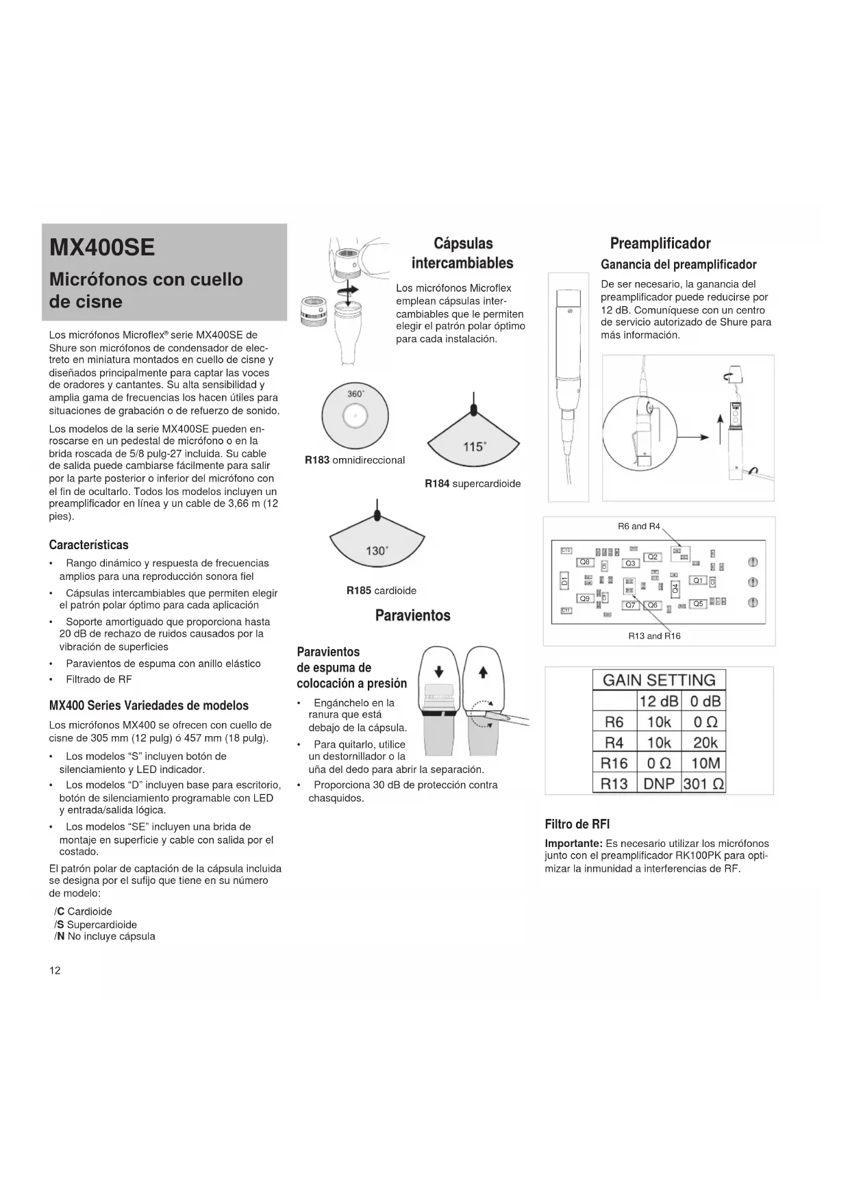 - Los modelos “SE” incluyen una brida de montaje en superficie y cable con salida por el costado. El patrón polar de captación de la cápsula incluida se designa por el sufijo que tiene en su número de modelo: /C Cardioide /S Supercardioide /N No incluye cápsula MX400SE Cápsulas intercambiables Los micrófonos Microflex emplean cápsulas inter- cambiables que le permiten elegir el patrón polar óptimo para cada instalación. R183 omnidireccional R184 supercardioide R185 cardioide Paravientos Paravientos de espuma de colocación a presión