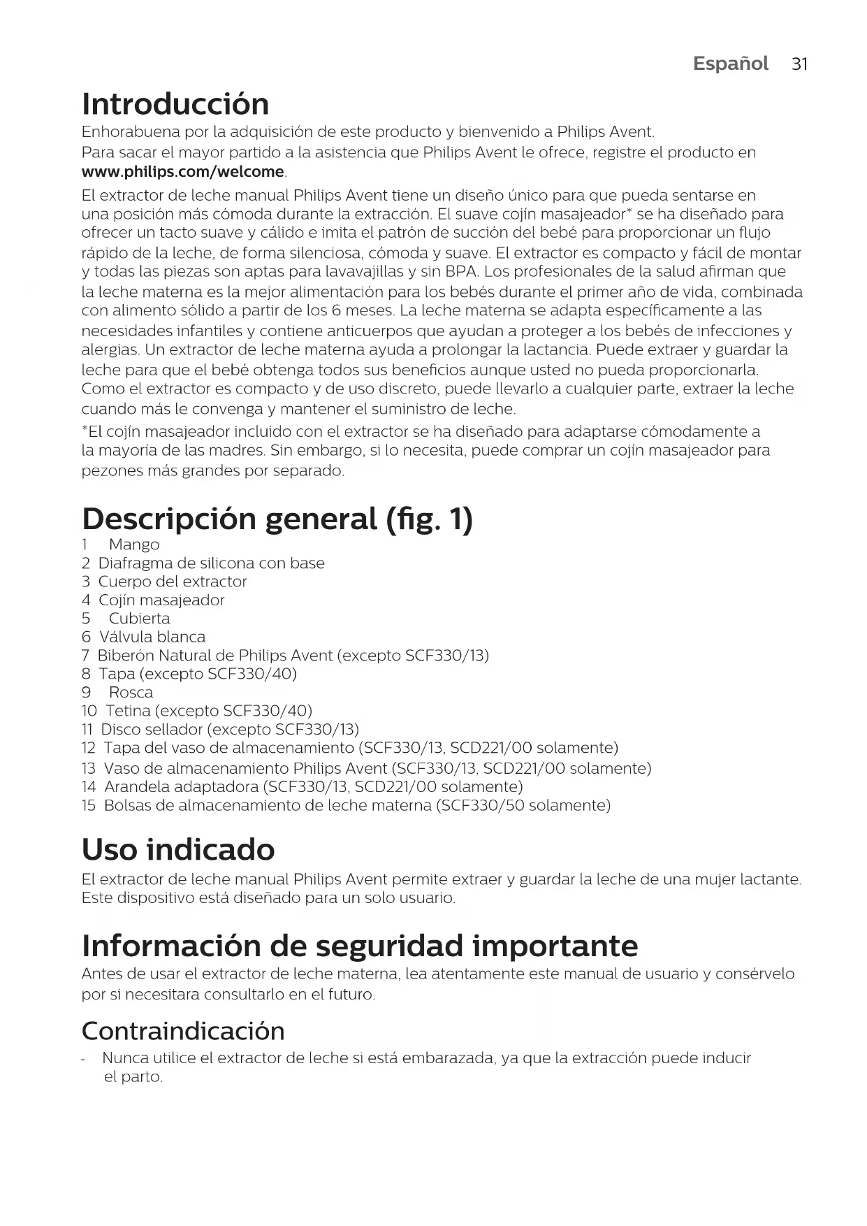 DeutschIntroducción Enhorabuena por la adquisición de este producto y bienvenido a Philips Avent. Para sacar el mayor partido a la asistencia que Philips Avent le ofrece, registre el producto en www.philips.com/welcome. El extractor de leche manual Philips Avent tiene un diseño único para que pueda sentarse en una posición más cómoda durante la extracción. El suave cojín masajeador* se ha diseñado para ofrecer un tacto suave y cálido e imita el patrón de succión del bebé para proporcionar un ujo rápido de la leche, de forma silenciosa, cómoda y suave. El extractor es compacto y fácil de montar y todas las piezas son aptas para lavavajillas y sin BPA. Los profesionales de la salud arman que la leche materna es la mejor alimentación para los bebés durante el primer año de vida, combinada con alimento sólido a partir de los 6 meses. La leche materna se adapta especícamente a las necesidades infantiles y contiene anticuerpos que ayudan a proteger a los bebés de infecciones y alergias. Un extractor de leche materna ayuda a prolongar la lactancia. Puede extraer y guardar la leche para que el bebé obtenga todos sus benecios aunque usted no pueda proporcionarla. Como el extractor es compacto y de uso discreto, puede llevarlo a cualquier parte, extraer la leche cuando más le convenga y mantener el suministro de leche. *El cojín masajeador incluido con el extractor se ha diseñado para adaptarse cómodamente a la mayoría de las madres. Sin embargo, si lo necesita, puede comprar un cojín masajeador para pezones más grandes por separado. Descripción general (g. 1) 1 Mango 2 Diafragma de silicona con base 3 Cuerpo del extractor 4 Cojín masajeador 5 Cubierta 6 Válvula blanca 7 Biberón Natural de Philips Avent (excepto SCF330/13) 8 Tapa (excepto SCF330/40) 9 Rosca 10 Tetina (excepto SCF330/40) 11 Disco sellador (excepto SCF330/13) 12 Tapa del vaso de almacenamiento (SCF330/13, SCD221/00 solamente) 13 Vaso de almacenamiento Philips Avent (SCF330/13, SCD221/00 solamente) 14 Arandela adaptadora (SCF330/13, SCD221/00 solamente) 15 Bolsas de almacenamiento de leche materna (SCF330/50 solamente) Uso indicado El extractor de leche manual Philips Avent permite extraer y guardar la leche de una mujer lactante. Este dispositivo está diseñado para un solo usuario. Información de seguridad importante Antes de usar el extractor de leche materna, lea atentamente este manual de usuario y consérvelo por si necesitara consultarlo en el futuro. Contraindicación - Nunca utilice el extractor de leche si está embarazada, ya que la extracción puede inducir el parto.