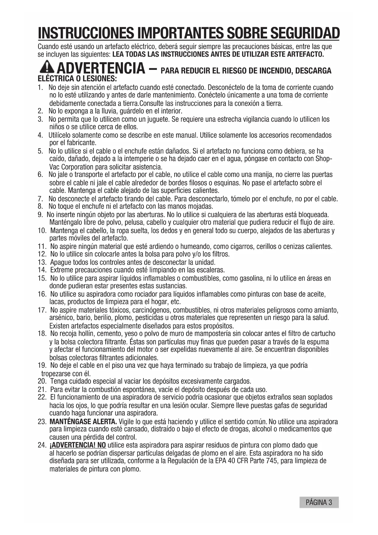 ¡ADVERTENCIA! NO utilice esta aspiradora para aspirar residuos de pintura con plomo dado que al hacerlo se podrían dispersar partículas delgadas de plomo en el aire. Esta aspiradora no ha sido diseñada para ser utilizada, conforme a la Regulación de la EPA 40 CFR Parte 745, para limpieza de materiales de pintura con plomo.