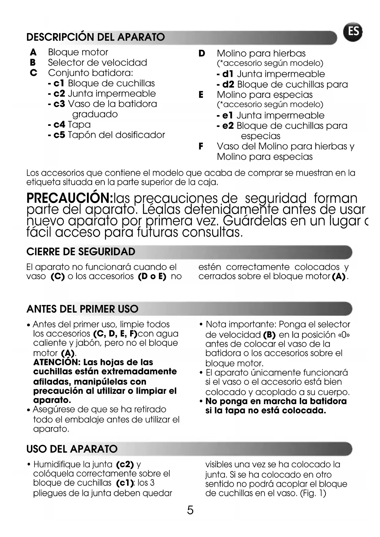Molino para hierbas (*accesorio según modelo) - d1 Junta impermeable - d2 Bloque de cuchillas para Molino para especias (*accesorio según modelo) - e1 Junta impermeable - e2 Bloque de cuchillas para especias Vaso del Molino para hierbas y Molino para especias Los accesorios que contiene el modelo que acaba de comprar se muestran en laetiqueta situada en la parte superior de la caja. PRECAUCIÓN: las precauciones de seguridad forman parte del aparato. Léalas detenidamente antes de usar su nuevo aparato por primera vez. Guárdelas en un lugar de fácil acceso para futuras consultas.