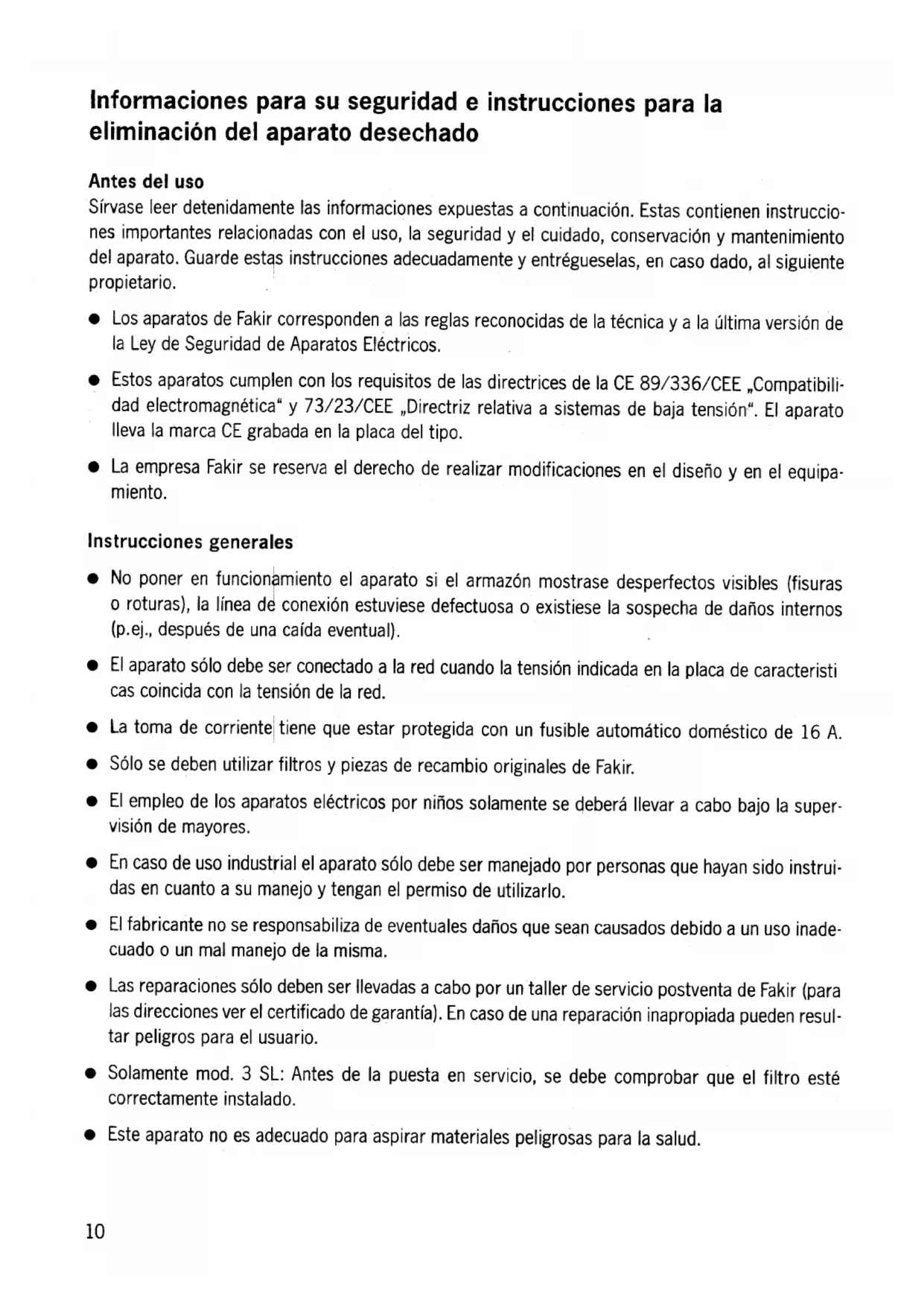 -Pendant I'utilisation de la machine, veiller a ne pas rouler sur le cordon d'alimentation, a ne P;:JS I'ecraser, le tirer exagerement, etc. -Examiner periodiquement le cordon d'ajimentation et s'assurer qu'il ne presente pas de deterio. rations ou de signes de fatigue. 8-Ne jamais mettre I'appareil en service ave'c un cordon d'alimentation dont I'etat paraltrait douteux. -Derouler le cable de teile sorte qu'il ne repose pas sur des aretes contondantes, ni ne soit emmele ou coince. -Toutes les prises de courant (c6te secteur ou c6te machine) doivent etre pour le moins etanches et protegees contre les eclaboussures d'eau. -Ne jamais utiliser de rallonges defectueuses! -Ne jamais debrancher la prise de courant en tirant sur le cordon d'alimentation! -Au remplacement du cordon d'alimentation, veiller a n'utiliser que le type original prescrit par le constructeur (H 05 WF 2 x 0,75), qui assure toutes les proprietes mecaniques et electriques requlses. .Toujours arreter I'appareil et le debrancher du reseau secteur avant toutes taches d'entretien reparation, changement de pieces et apres I'usage de I'appareil. .Ne jamais entreposer I'appareil a I'exterieur! .Ne nettoyer I'appareil qu'avec un tissu sec ou a peine humide! Les pieces conductrices d'electri- cite (interrupteur, fiche, prise de courant, electronique, etc.) ne doivent jamais entrer en contact avec de I'eau! Comment se debarrasser d'un appareil devenu inutilisable Tenir compte, pour se debarrasser du materiau d'emballage de I'appareil ainsi que de I'appareillui- meme, celui-ci une fois devenu inutilisable, des prescriptions locales relatives a la protection de I'envi- ronnement. Renseignez-vous.aupres des autorites competentes ou de I'entreprise d'enlevement des dechets encombrants. .Trier le materiau d'emballage (generalement recyclable) et le jeter dans les conteneurs de recupe- ration prevus a cet effet. .Rendre immediatement inutilisables des appareils mis a la remise et s'en debarrasser ensuite en se conformant aux prescriptions locales relatives a la protection de I'environnement. 9Intormaciones para su seguridad e instrucciones para la eliminacion dei aparato desechado Antes dei uso Sfrvase leer detenidamente las informaciones expuestas a continuaci6n. Estas contienen instruccio. nes importantes relacionadas con el uso, la seguridad y el cuidado, conservaci6n y mantenimiento dei aparato. Guarde est4s instrucciones adecuadamente y entregueselas, en caso dado, al siguiente propietario. .Los aparatos de Fakir corresponden a las reglas reconocidas de la tecnica y a la ultima version de la Ley de Seguridad de Aparatos Electricos. .Estos aparatos cumplen con los requisitos de las directrices de la CE 89/336/CEE "Compatibili- dad electromagnetica" y 73/23/CEE "Directriz relativa a sistemas de baja tensi6n". EI aparato Ileva la marca CE grabada en la placa dei tipo. .La empresa Fakir se reserva el derecho de realizar modificaciones en el disefio yen el equipa- miento. Instrucciones generales .No poner en funcion~miento el aparato si el armaz6n mostrase desperfectos visibres (fisuras o roturas), la Ifnea d~ conexi6n estuviese defectuosa o existiese la sospecha de daiios internos (p.ej., despues de una cafda eventual). .EI aparato s610 debe ser conectado a la red cuando la tensi6n indicada en la placa de caracteristi cas coincida con la tensi6n de la red. .La toma de corrientel tiene que estar protegida con un fusible automatico domestico de 16 A. .Solo se deben utililar filtros y pielas de recambio originales de Fakir. .EI emplea de las aparatas electrfcas par niiias salamente se debera Ilevar a caba baja la super- vision de mayares. .En caso de uso industrial el aparatos61o debe ser manejado por personas que hayan sido instrui- das en cuanto a su manejo y tengan el permiso de utilizarlo. .EI fabricante no se responsabilila de eventuales daiios que sean causados debido a un uso inade- cuado o un mal manejo de la misma. .Las reparaciones s610 deben ser Ilevadas a cabo por un taller de servicio postventa de Fakir (para las direcciones ver el certificado de garantra). En caso de una reparaci6n inapropiada pueden resul- tar peligros para el usuario. .Solamente mod. 3 SL: Antes de la puesta en servicio, se debe comprobar que el filtro este correctamente instalado. .Este aparato no es adiecuado para aspirar materiales peligrosas para la salud. 10Instrucciones relativas a la seguridad .En los aparatos accionados electricamente se debe observar 10 siguiente: -Durante el servicio es peligroso cruzar, magullar, estirar 0 realizar acciones similares con el cable de conexi6n que 10 puedan deteriorar 0 destruir. -Se debe comprobar peri6dicamente la linea de conexi6n par si existen indicios de desperfectos 0 de envejecimiento. -No debe utilizarse el aparato si el cable de conexi6n no se encontrase en perfecto estado. -No tirar ni pasar el cable de conexi6n par encima de bordes afilados. -Los acoplamientos de las lineas de conexi6n a la red y de los aparatos deben estar como minima protegidos contra salpicaduras de agua. -No utilizar cables de alargo defectuosos. -No extraer nunca el enchufe de la caja de enchufes, cogiendolo par el cable de conexi6n. -Cuando se utilicen 0 se cambien las Ilneas de conexi6n a la red, no debe variarse el equipa- miento indicado par el fabricante (H 05 WF 2 x 0,75) y debe garantizarse la resistencia mecanica dei mismo. .Antes de realilar mantenimiento o reparaci6n, antes dei cambio de pielas y despues de utililar la mc:3quina, se la debe desconectar y extraerse dei enchufe de la red. .EI aparata na debe ser guardada en estancias descubiertas a en ei exteriar. .Para la limpieza dei aparato emplear unicamente un pafio seco o ligeramente humedecido. Durante este trabajo se tiene que evitar que los componentes que conducen corriente electrica (interruptor, enchufe, caja de enchufe, electr6nica, etc.) no entren en contacto con agua. Instrucciones para la eliminaci6n dei aparato desechado Ni el embalaje dei aparato, ni el fil