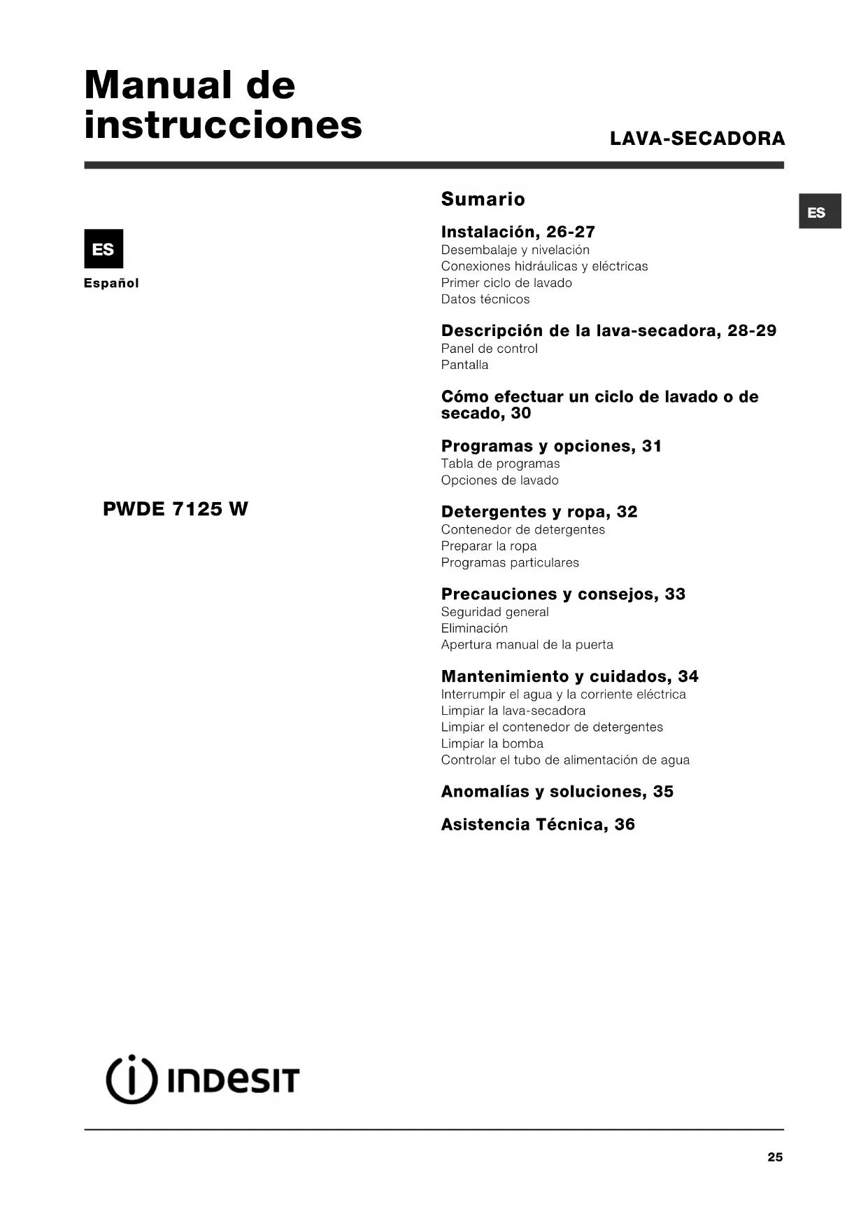 LAVA-SECADORA Sumario Instalación, 26-27 Desembalaje y nivelación Conexiones hidráulicas y eléctricas Primer ciclo de lavado Datos técnicos Descripción de la lava-secadora, 28-29 Panel de control Pantalla Cómo efectuar un ciclo de lavado o de secado, 30 Programas y opciones, 31 Tabla de programas Opciones de lavado Detergentes y ropa, 32 Contenedor de detergentes Preparar la ropa Programas particulares Precauciones y consejos, 33 Seguridad general Eliminación Apertura manual de la puerta Mantenimiento y cuidados, 34 Interrumpir el agua y la corriente eléctrica Limpiar la lava-secadora Limpiar el contenedor de detergentes Limpiar la bomba Controlar el tubo de alimentación de agua Anomalías y soluciones, 35 Asistencia Técnica, 36 PWDE 7125 W Manual de instrucciones26